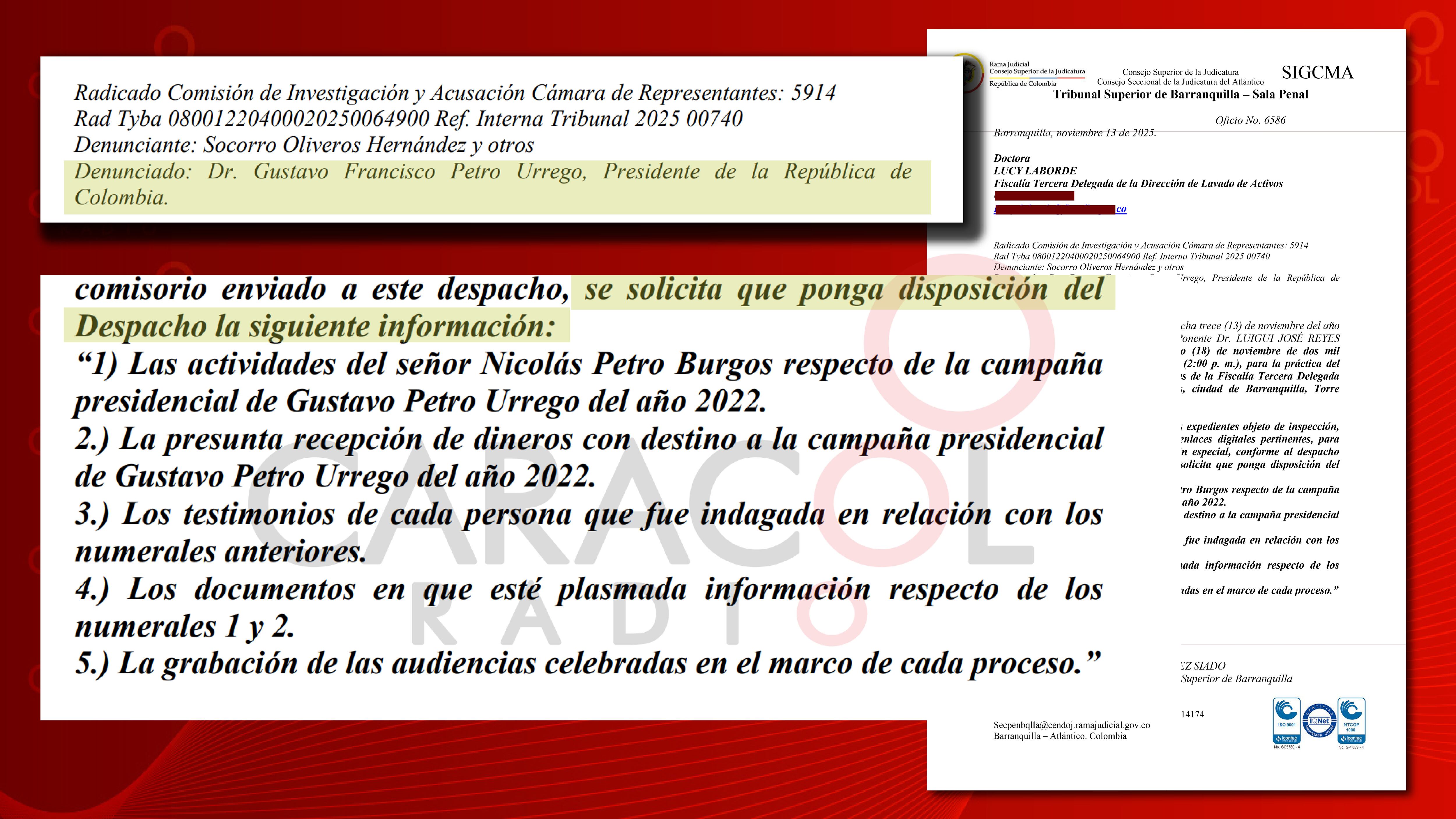 También se pide copia de la información por la presunta recepción de dineros con destino a la campaña presidencial, los testimonios a personas que fueron indagadas por ese asunto y la respectiva documentación.