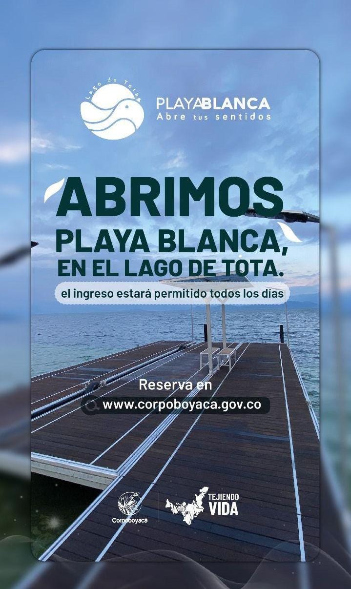 Corpoboyacá anunció que Playa Blanca, en el Lago de Tota, abrirá sus puertas todos los días a partir del 18 de noviembre, manteniendo el modelo de manejo responsable implementado desde 2024.