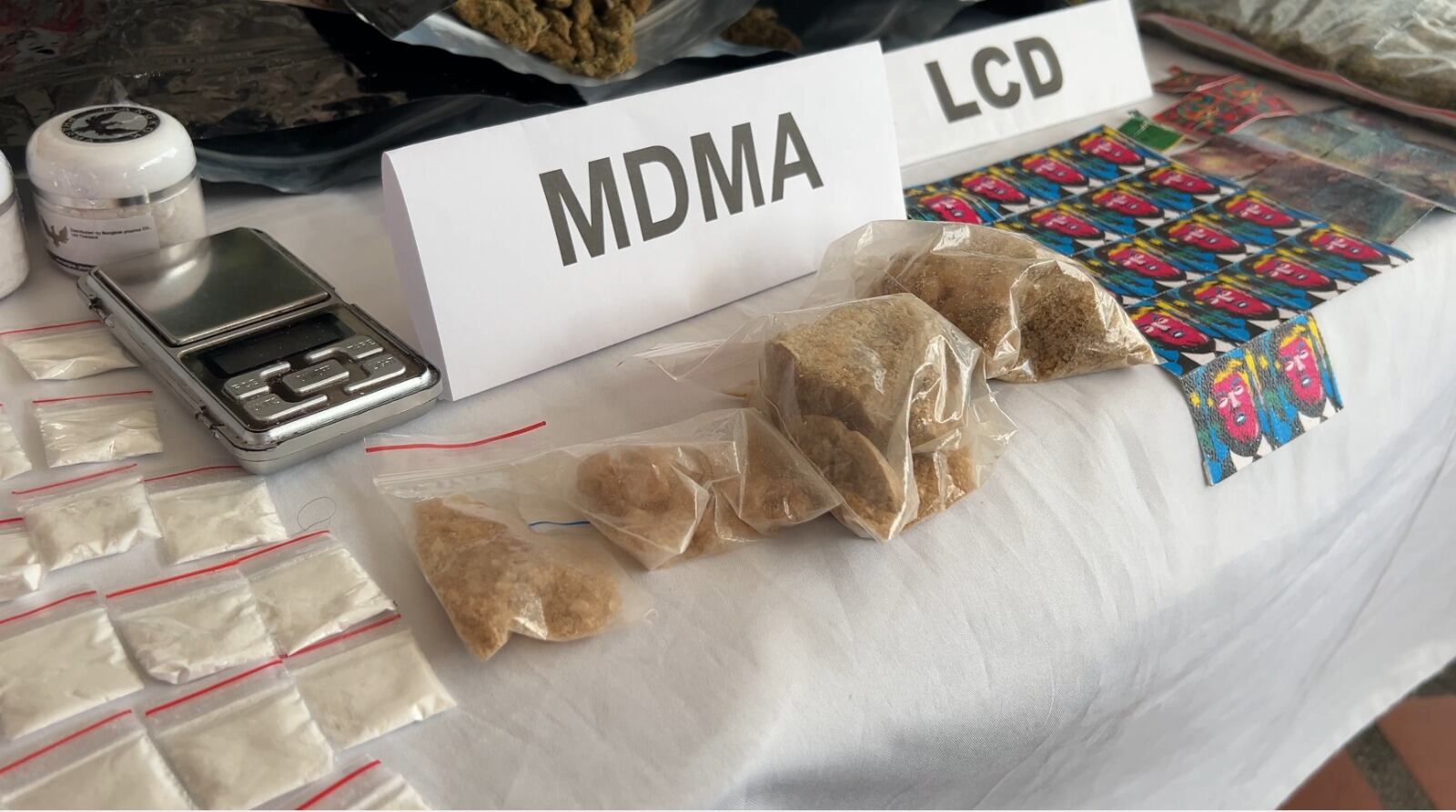 Encontraron 67 frascos de ketamina, 260 dosis de tusi, cuatro mil gramos de marihuana, 500 gramos de cocaína, 100 pastillas de anfetamina, 200 pastillas de éxtasis, 180 gramos de MDMA, 500 cuadros de LCD, un arma traumática, una gramera, cuatro celulares y seis millones en efectivo; parte de la droga estaba dosificada y otro cantidad estaba aún almacenada.