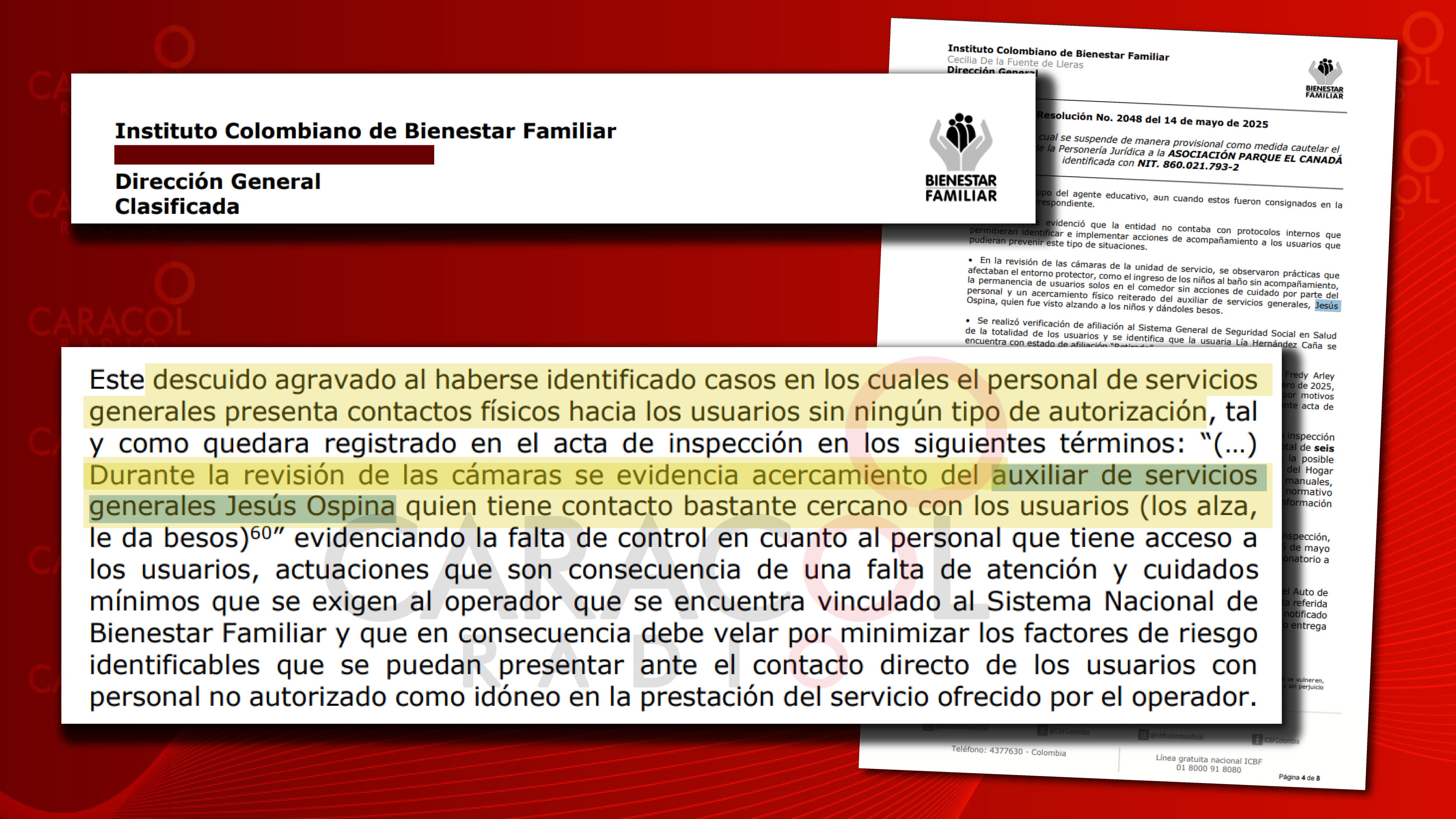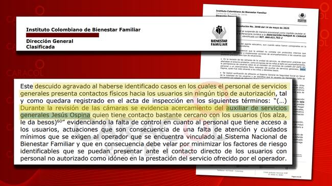 El documento del ICBF, al que tuvo acceso CARACOL RADIO advierte que el entonces auxiliar de servicios generales Jesús Ospina, quedó grabado en las cámaras de seguridad “alzando a los niños y dándoles besos”.
