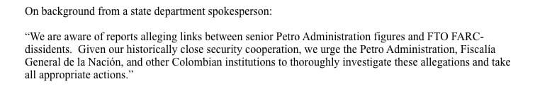 “Tenemos conocimiento de informes que alegan vínculos entre altos funcionarios de la Administración Petro y disidentes de las FARC. Dada nuestra histórica y estrecha cooperación en materia de seguridad, instamos a la Administración Petro, a la Fiscalía General de la Nación y a otras instituciones colombianas a investigar exhaustivamente estas acusaciones y tomar las medidas pertinentes”, expresa el funcionario de la administración de Donald Trump.