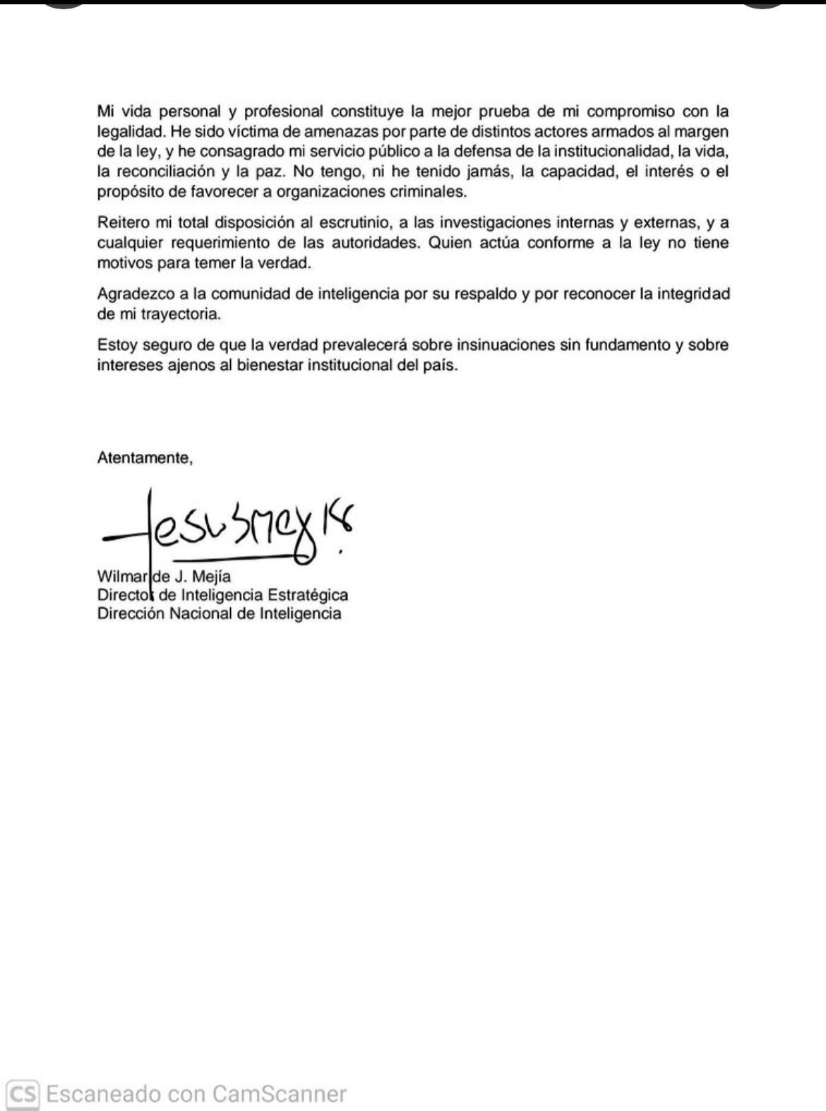 A través de un comunicado, Wilmar Mejía rechazó las acusaciones y aseguró que nunca se ha reunido con personas al margen de la ley, ni mucho menos ha recibido órdenes del presidente Gustavo Petro, ni del Director de la Dirección Nacional de Inteligencia, Jorge Lemus, para esto.
