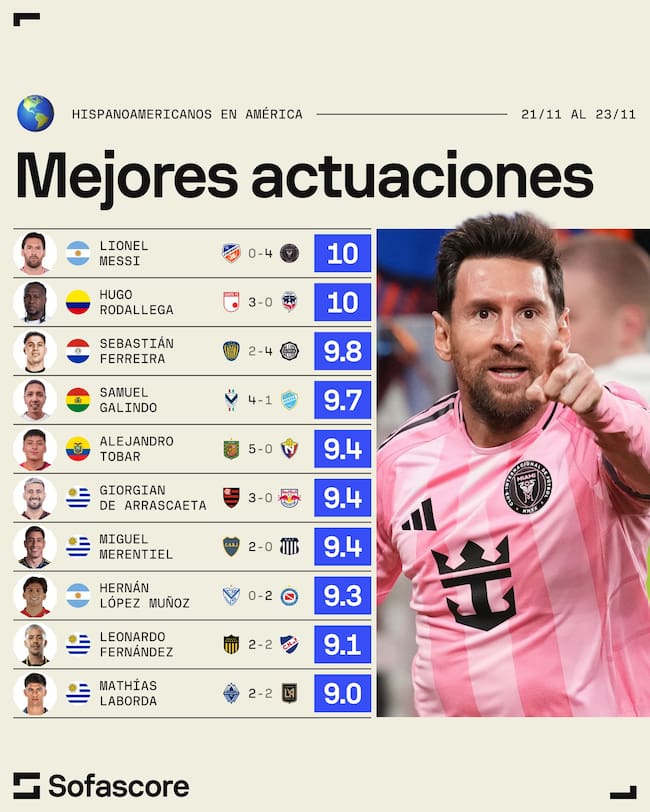 Si bien Rodallega después aclaró que nunca dijo que era mejor que Messi, ante la mala interpretación que se le dio, hoy una distinción los une luego de sus grandes actuaciones en el último fin de semana. El argentino hizo triplete de asistencias y un gol en el triunfo de Inter Miami por 0-4 ante Cincinnati en la semifinal de conferencia, mientras que Hugo fue figura al marcar tres goles en la victoria de Santa Fe 3-0 contra Fortaleza por la fecha 2 de cuadrangulares.