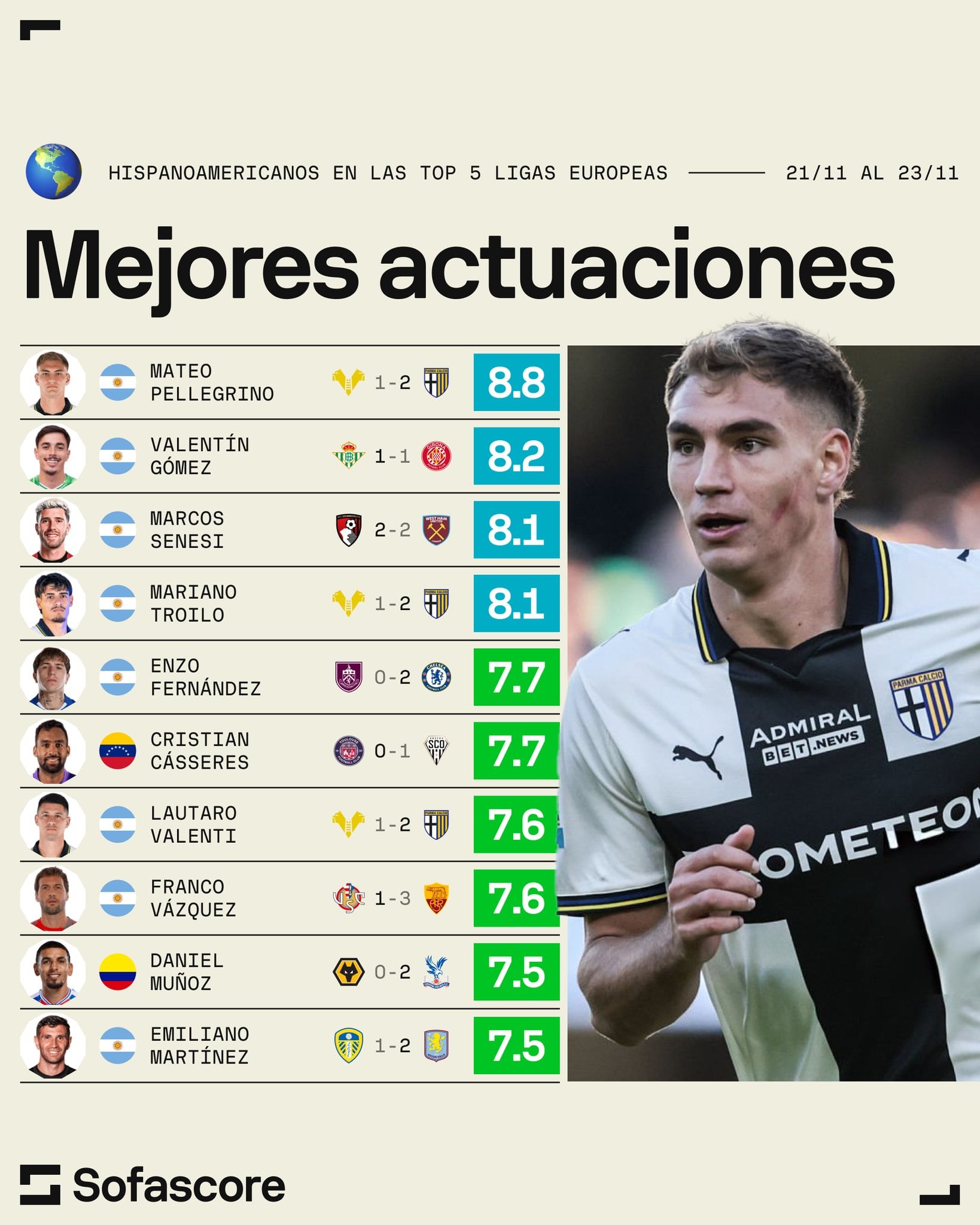 SofaScore realiza otros escalafones destacando los jugadores que tuvieron mejores puntajes en el mundo. Entre esos, está el nombre de Daniel Muñoz, que obtuvo el noveno puntaje (7.5) de los hispanoamericanos en las cinco mejores ligas de Europa.