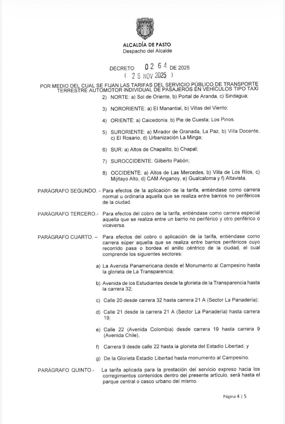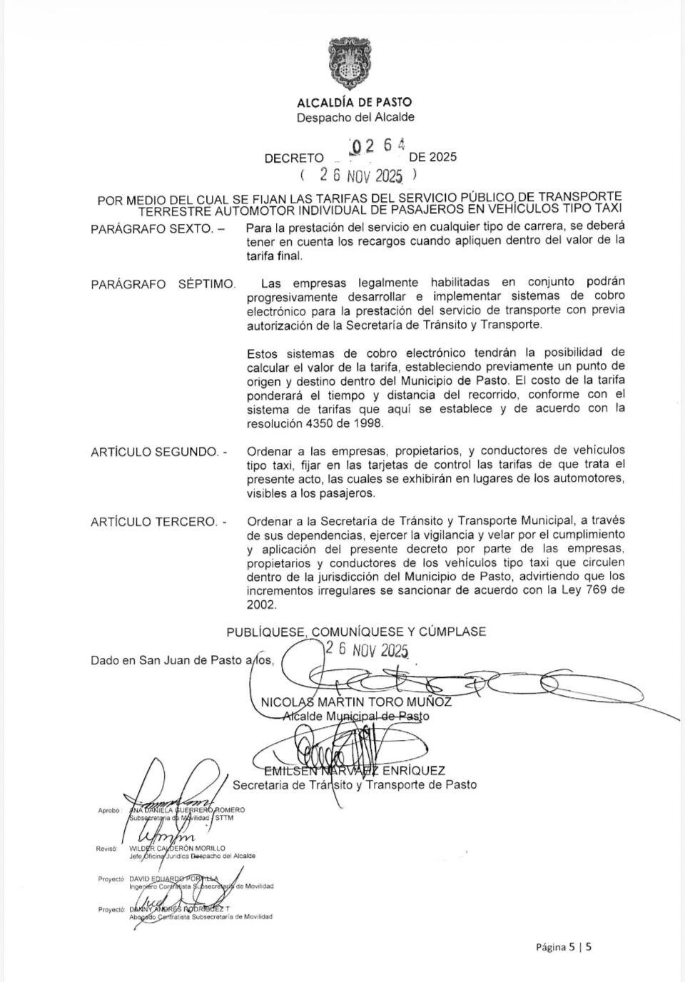 Entró en vigencia el Decreto 0264 de noviembre 26 de 2025 a través del cual se establece las nuevas tarifas de taxi en Pasto.