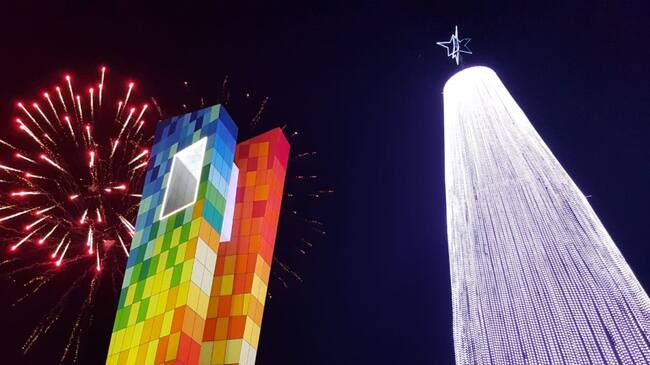 El árbol, de 66 metros de altura, se convirtió una vez más en una de las atracciones navideñas más impactantes del país. Su instalación estuvo a cargo de 120 colaboradores del Grupo Tecnoglass, quienes trabajaron durante semanas para lograr un montaje impecable.