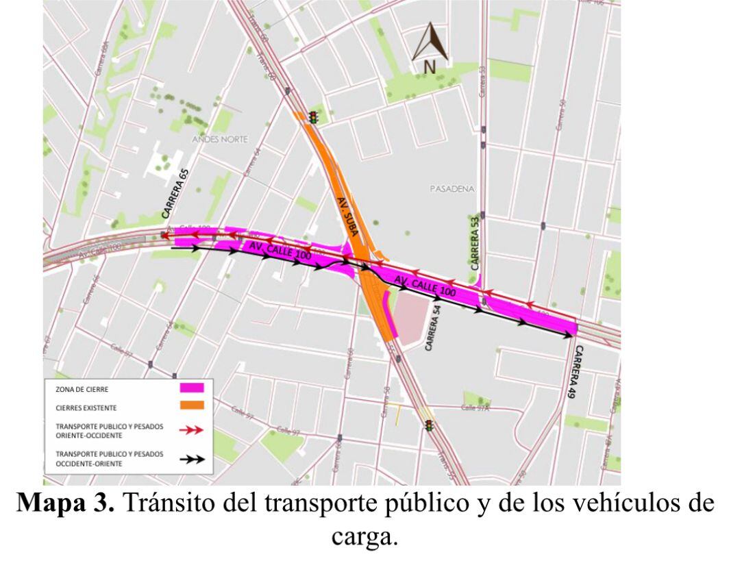 - Las rutas de transporte público y vehículos de carga que transitan por la Av. Calle 100 en sentido Occidente – Oriente deberán transitar por los dos carriles que quedarán habilitados sobre el corredor en sentido Occidente - Oriente (Mapa 3 – flecha negra).