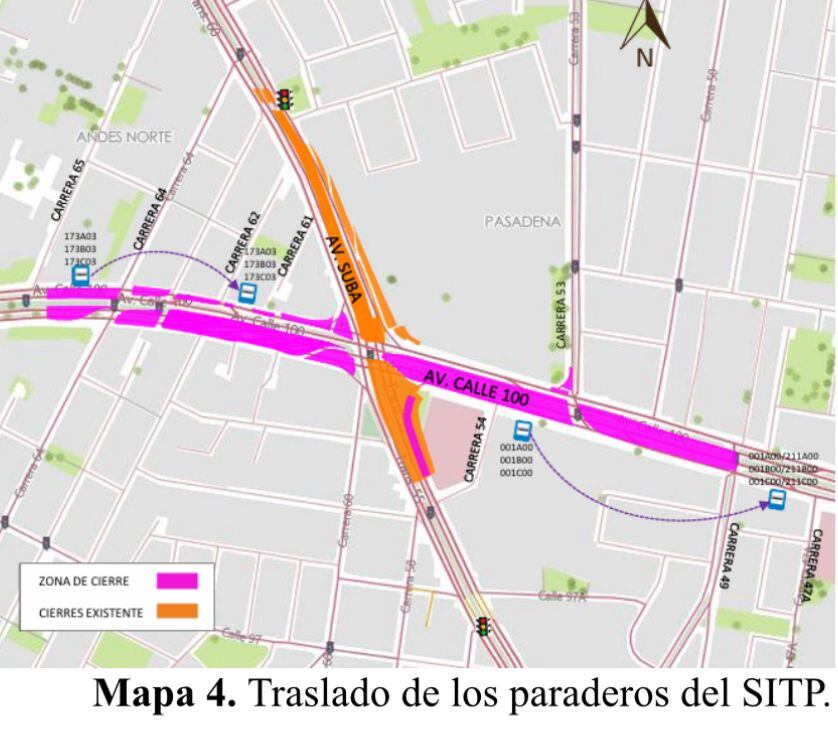 - Los paraderos 173A03/173B03 y 173C03 ubicados en el andén Norte de la Av. Calle 100 entre carrera 64 y carrera 65, serán trasladados temporalmente al andén Norte de la Av. Calle 100 entre carrera 62 y carrera 61 (Mapa 4).