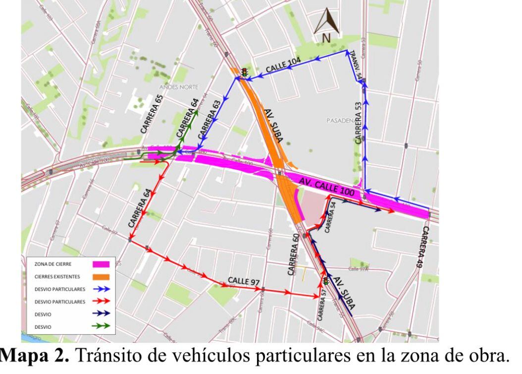- Los usuarios que transitan por la Av. Calle 100 en sentido Occidente – Oriente podrán tomar la carrera 64 al Sur, calle 97 al Oriente, carrera 57 al Norte, Av. Suba al Norte y carrera 54 al Norte hasta empalmar con la Av. Calle 100 para continuar con su recorrido habitual al Oriente (Mapa 2 – flecha roja).