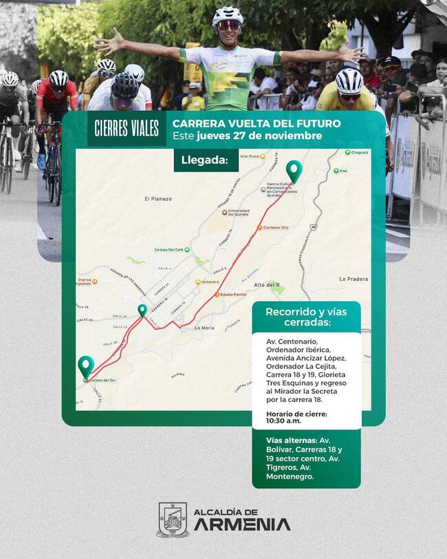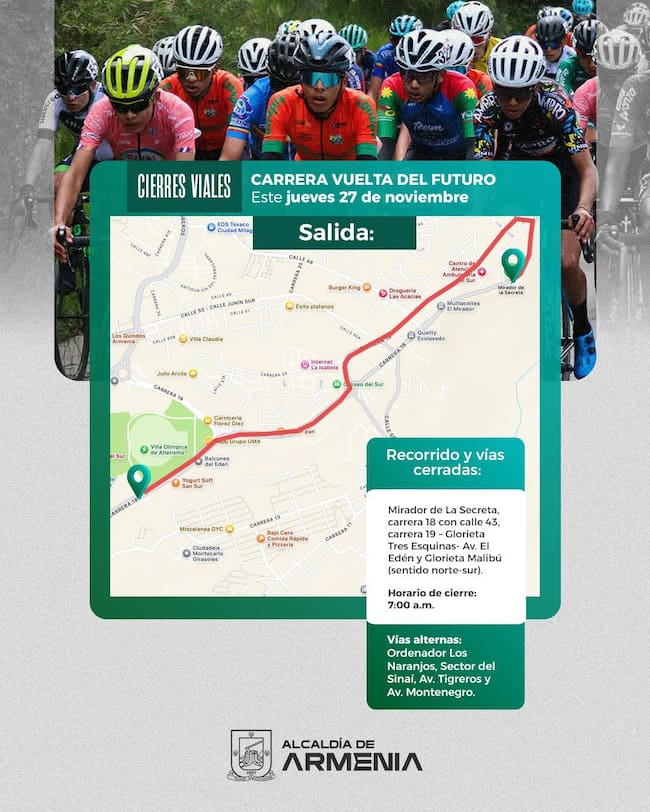 Debido al inicio de la Vuelta del Futuro 2025 de ciclismo HOY jueves 27 de noviembre con una primera etapa de 64.3 km que partirá desde Armenia y pasará por los municipios de La Tebaida, Montenegro y Circasia, antes de regresar a la capital quindiana.