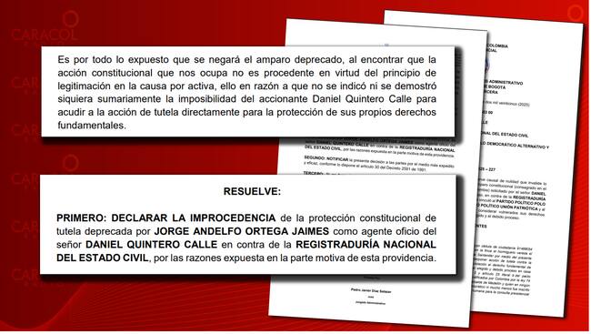La tutela contra la Registraduría alegaba una supuesta vulneración a los derechos fundamentales de Daniel Quintero —igualdad, debido proceso y el derecho a elegir y ser elegido porque le negaron la inscripción por firmas para aspirar a la Presidencia.