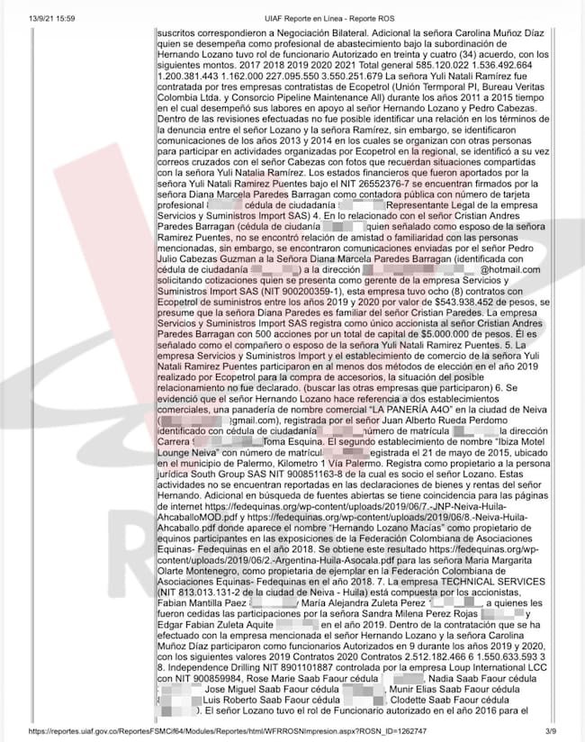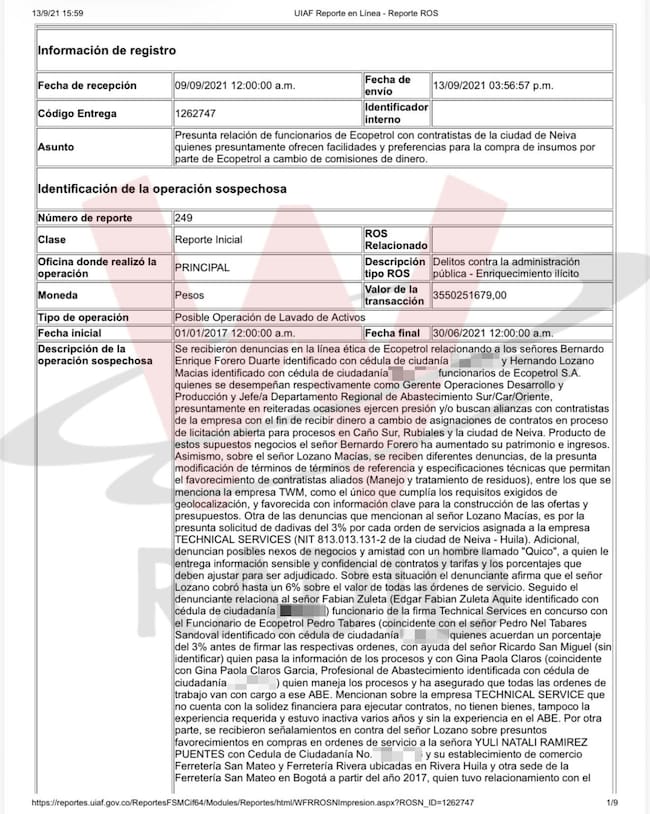 El primero de los Reportes de Operaciones Sospechosas (ROS) de Forero Duarte de la UIAF, sobre las actividades de Forero Duarte, está fechado el 9 de septiembre de 2021 a las 12 del día. El ROS describe que se trata de “Delitos contra la administración pública” y “Posible Operación de lavado de activos”.