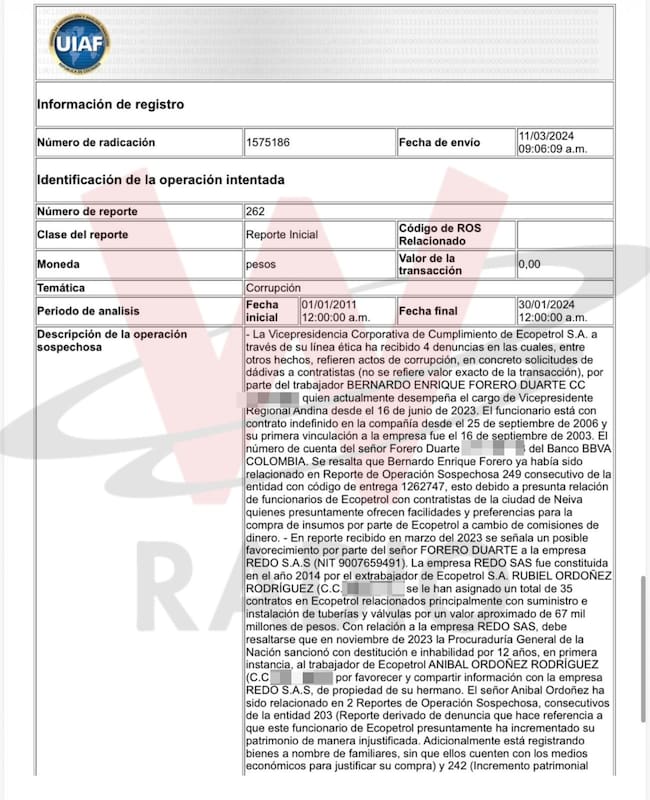 Hay un segundo reporte de operaciones sospechosas de la UIAF sobre el ingeniero Bernardo Forero Duarte. Es del 11 de marzo de 2024 a las 6:09 de la mañana. El documento dice que su temática es corrupción e indica: “La vicepresidencia corporativa de Cumplimiento de Ecopetrol ha recibido, a través de la línea ética, 4 denuncias que refieren actos de corrupción, en concreto solicitudes de dádivas a contratistas (no se refiere valor exacto de la transacción) por parte del trabajador Bernardo Enrique Forero Duarte”.
