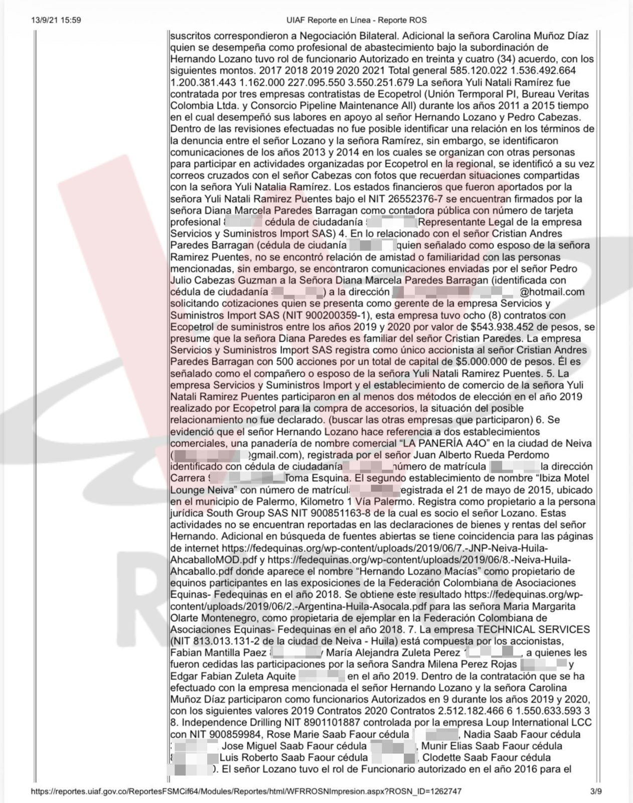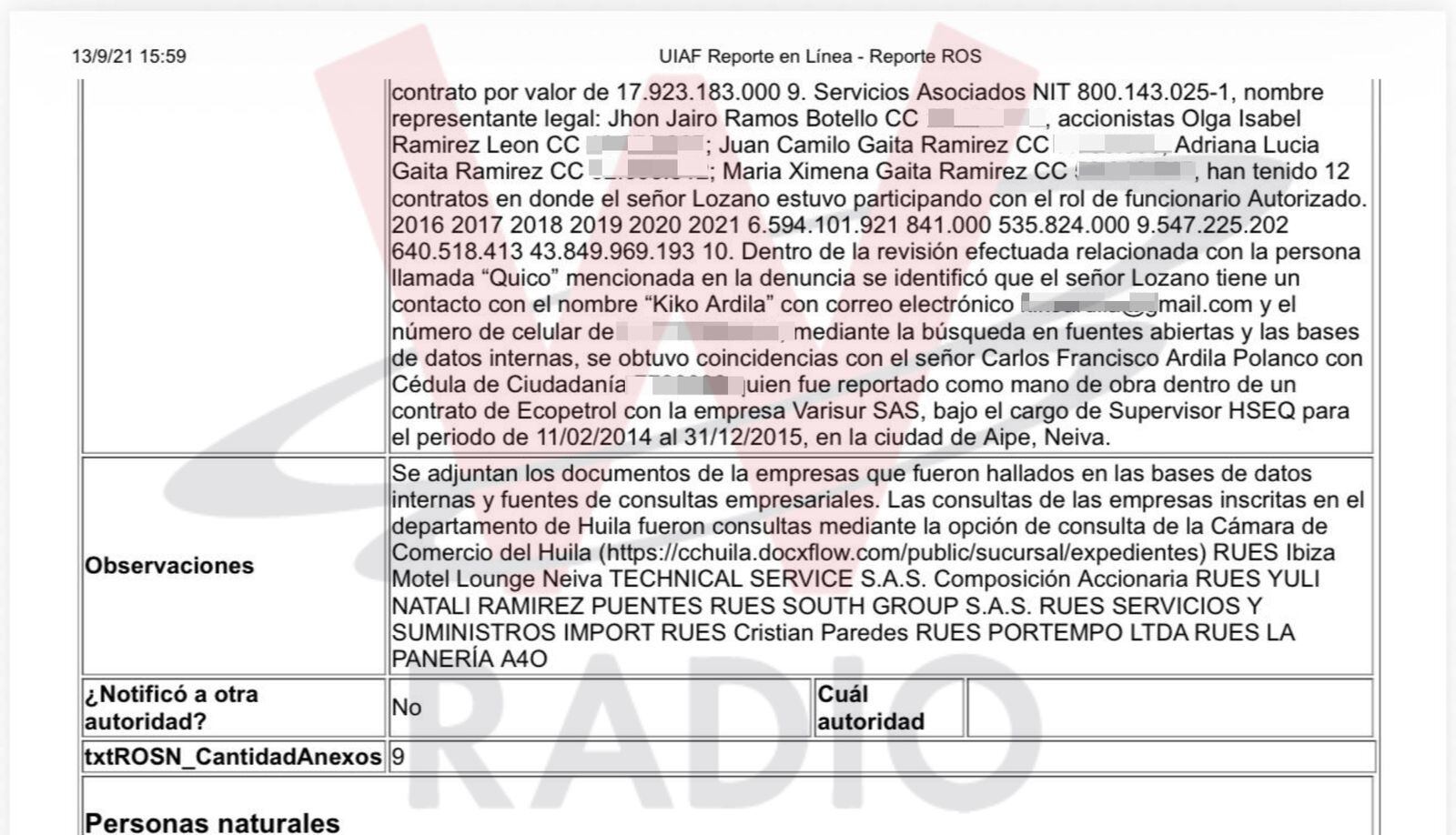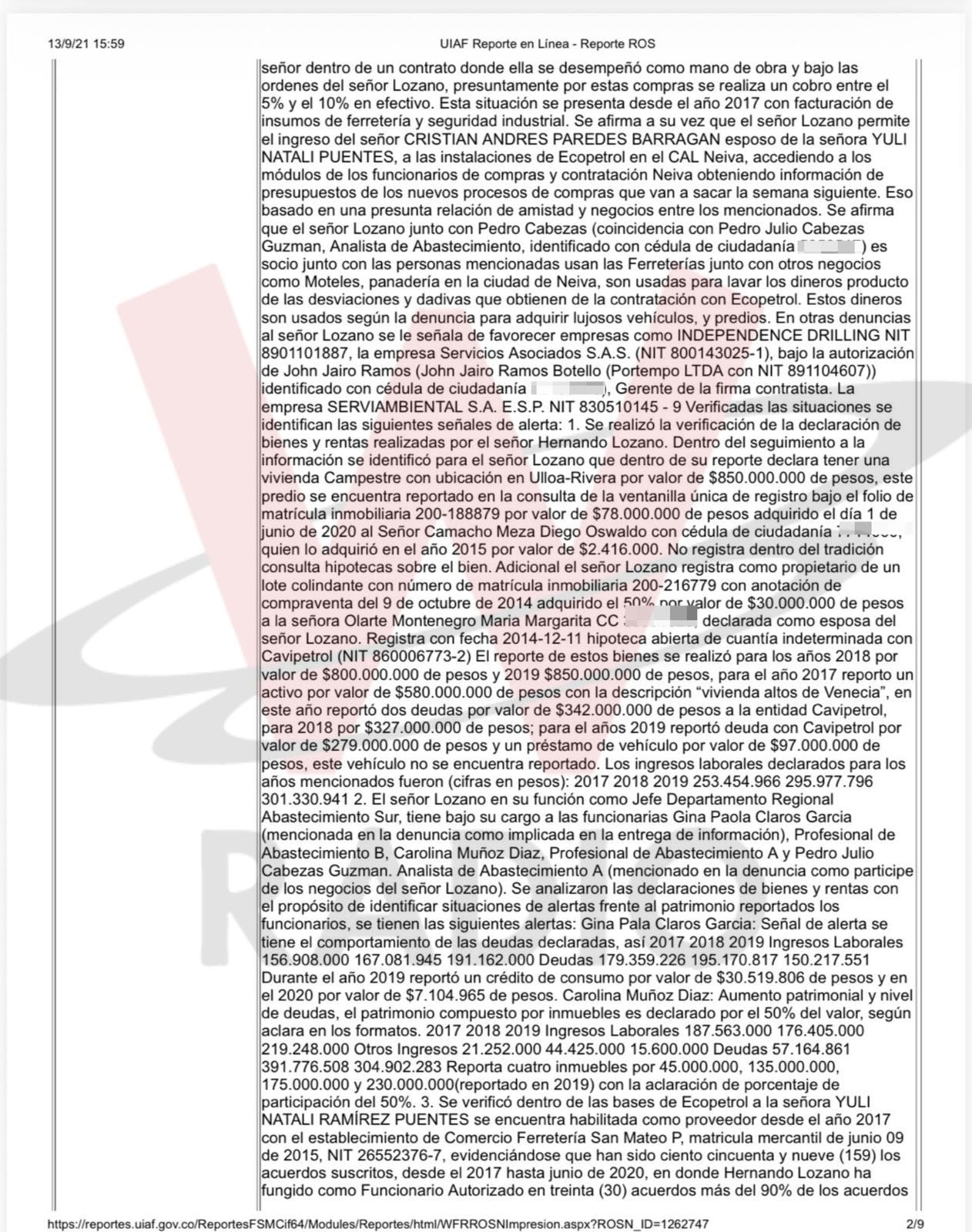 El primero de los Reportes de Operaciones Sospechosas (ROS) de Forero Duarte de la UIAF, sobre las actividades de Forero Duarte, está fechado el 9 de septiembre de 2021 a las 12 del día. El ROS describe que se trata de “Delitos contra la administración pública” y “Posible Operación de lavado de activos”.