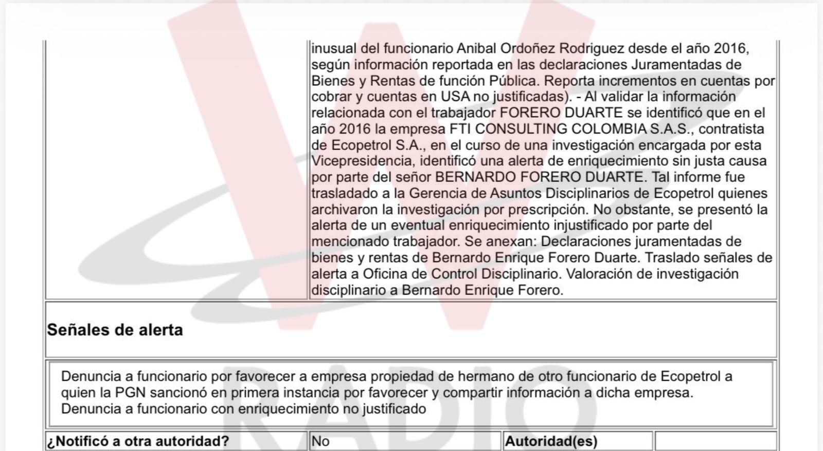 Dice también ese reporte que “al validar la información relacionada con el trabajador Forero Duarte se identificó que en el año 2016 FTI Consulting Colombia SAS (…) identificó una alerta de enriquecimiento sin justa causa por parte del señor Bernardo Forero Duarte. Tal informe fue trasladado a la Gerencia de Asuntos Disciplinarios de Ecopetrol quienes archivaron la investigación por prescripción”.