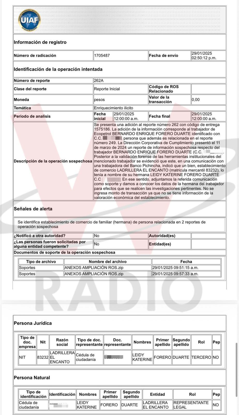 Hay otro reporte del 29 de enero de este año, 2025, a las 2:50 de la tarde. Allí señalan que la Dirección Corporativa de Cumplimiento tiene en su poder una comunicación entre el ingeniero Forero y una empleada del Banco Pichincha, a quien él le confiesa que es el verdadero dueño de la Ladrillera El Encanto, aunque en papeles figure a nombre de su hermana Leidy Katerine Forero Duarte.