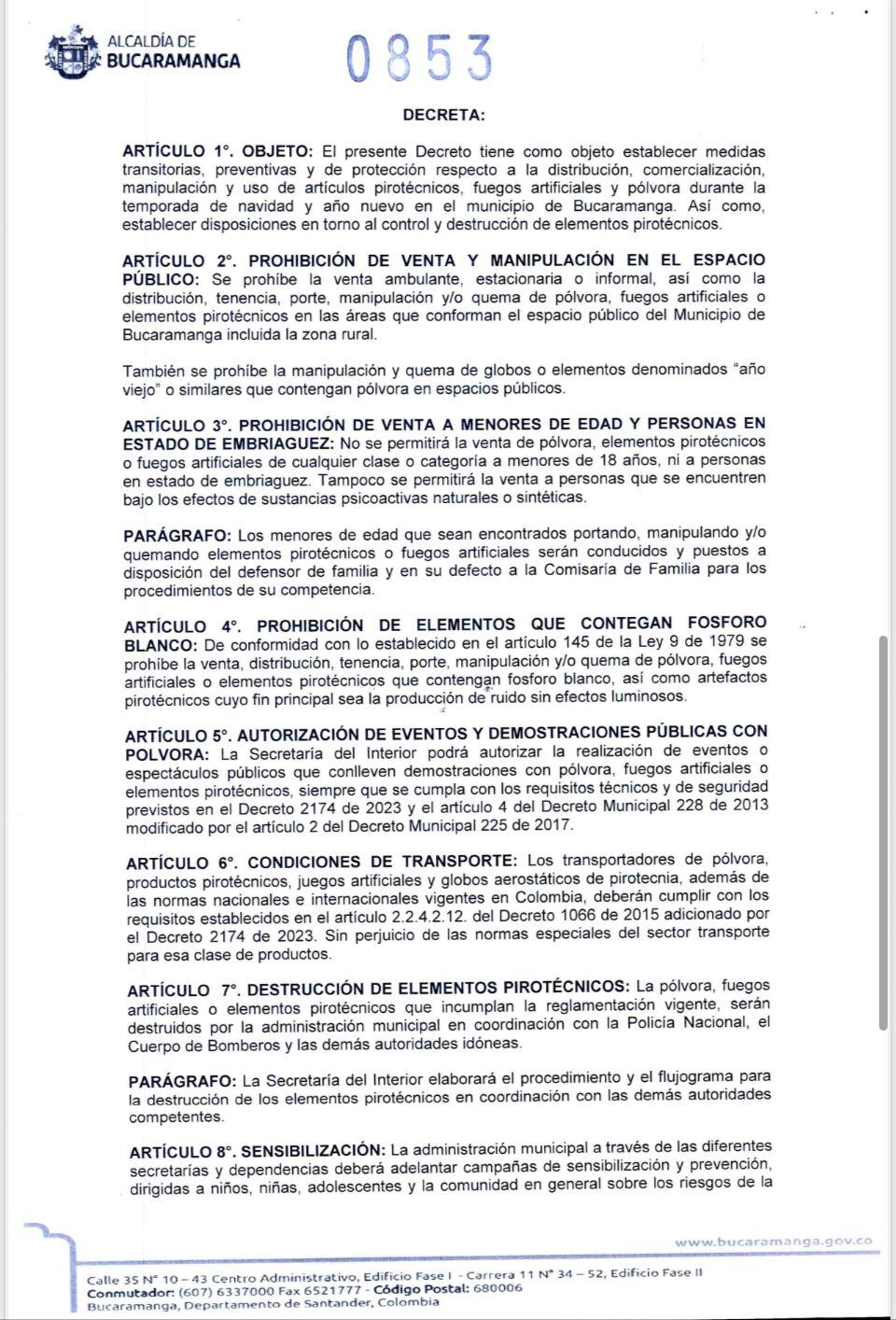 En el decreto 0853, la Alcaldía de Bucaramanga establece una prohibición estricta al uso de pólvora por parte de menores de edad. La norma es contundente: ni siquiera con la supervisión de un adulto está permitido que los niños manipulen este tipo de elementos.