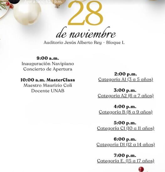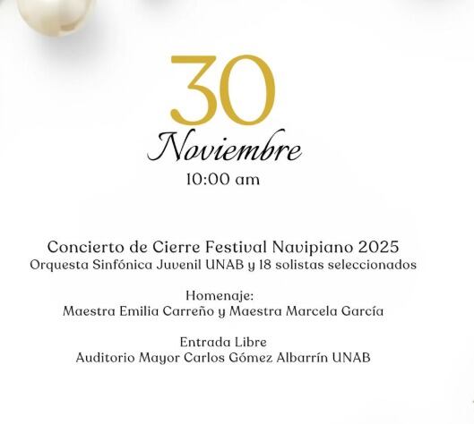 Con recitales, talleres, conferencias y repertorios llenos del encanto de la Navidad, este viernes 28 de noviembre inició en Bucaramanga Navipiano 2025, un evento académico y artístico organizado por la Universidad Autónoma de Bucaramanga (UNAB), la Escuela de Música Mezzoforte, la Orquesta Sinfónica Juvenil, el proyecto sinfónico y un total de diez instituciones musicales que se unieron para celebrar el fin de año a través del piano y la música orquestal.