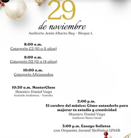 El domingo, a las 10:00 de la mañana, será el esperado concierto de clausura en el Auditorio Mayor de la UNAB. Allí, la Orquesta Sinfónica Juvenil interpretará piezas navideñas junto a los 18 mejores solistas seleccionados por un jurado.