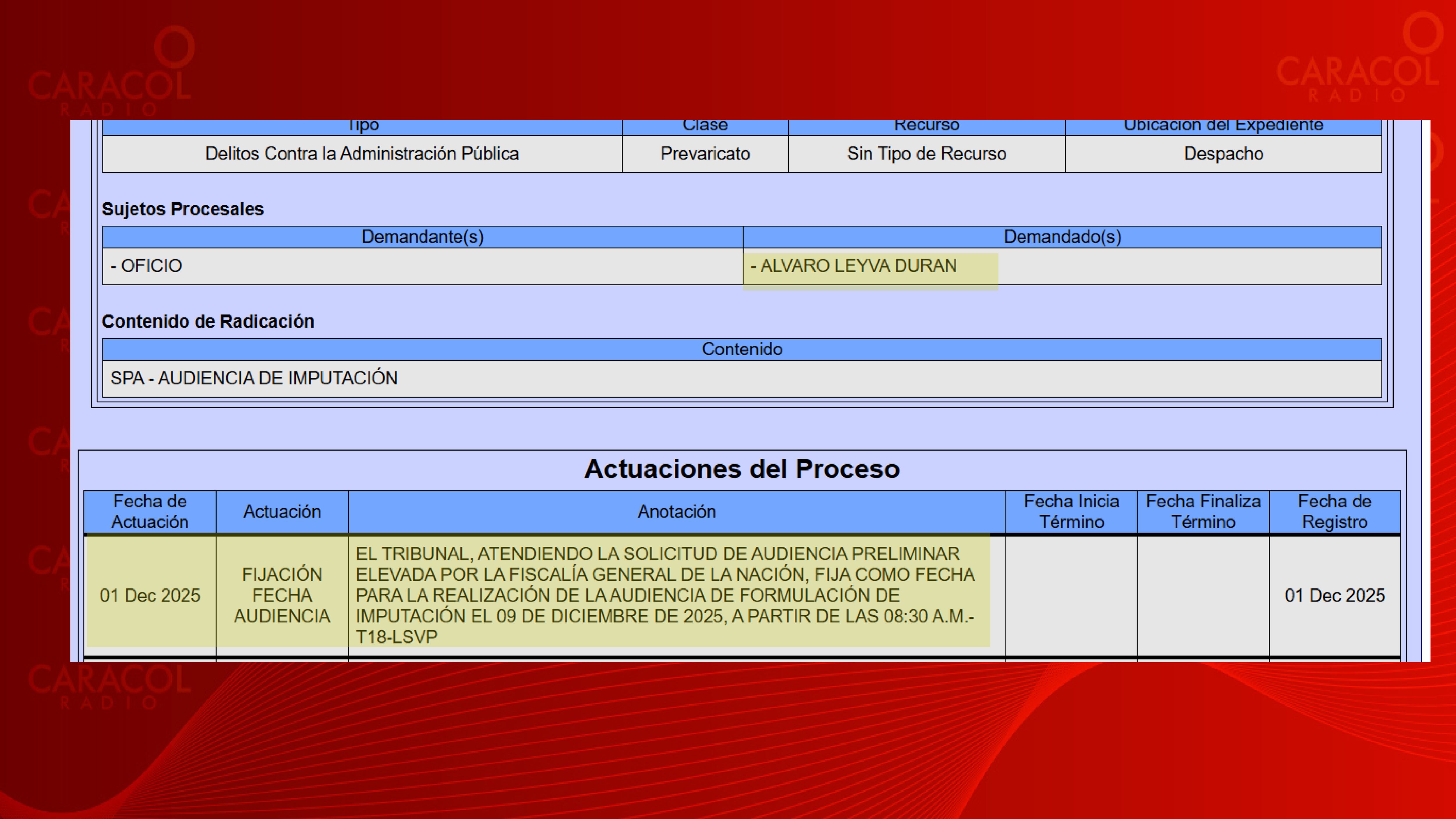 Para el 9 de diciembre a las 8:30 am quedó programada la audiencia de imputación de cargos en contra del excanciller Álvaro Leyva por el escándalo de la licitación de los pasaportes.