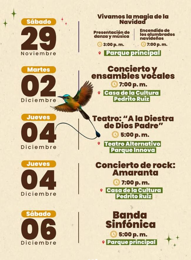 Sara Cardona, promotora cultural del municipio, declara que, dentro de la zona urbana, diversos escenarios ofrecen al público una agenda cultural especial para quienes deseen vivir una experiencia llena de talento, creatividad y raíces culturales: “Dentro de la agenda que tenemos programada para estas dos semanas, contamos con espacios como el Parque Innova, el Parque Principal y también el Parque de la Poesía”.