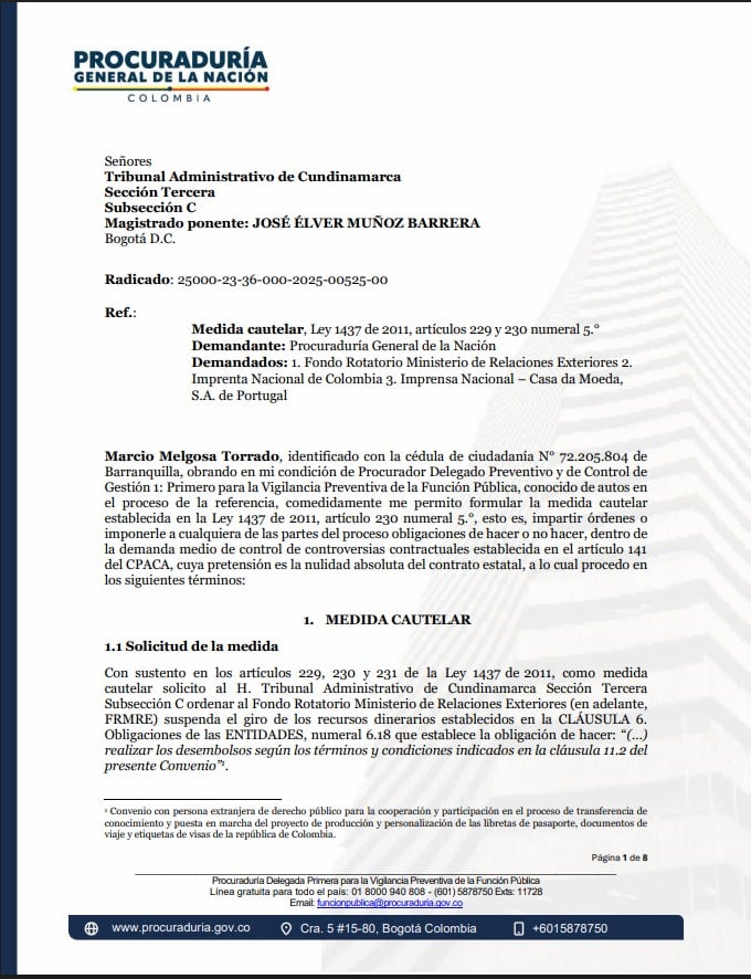 La Procuraduría pidió al Tribunal Administrativo de Cundinamarca que decrete una medida cautelar y suspenda el giro de dinero de la Cancillería a la Casa de la Moneda de Portugal mientras se resuelve la demanda contra el convenio para la expedición de pasaportes.