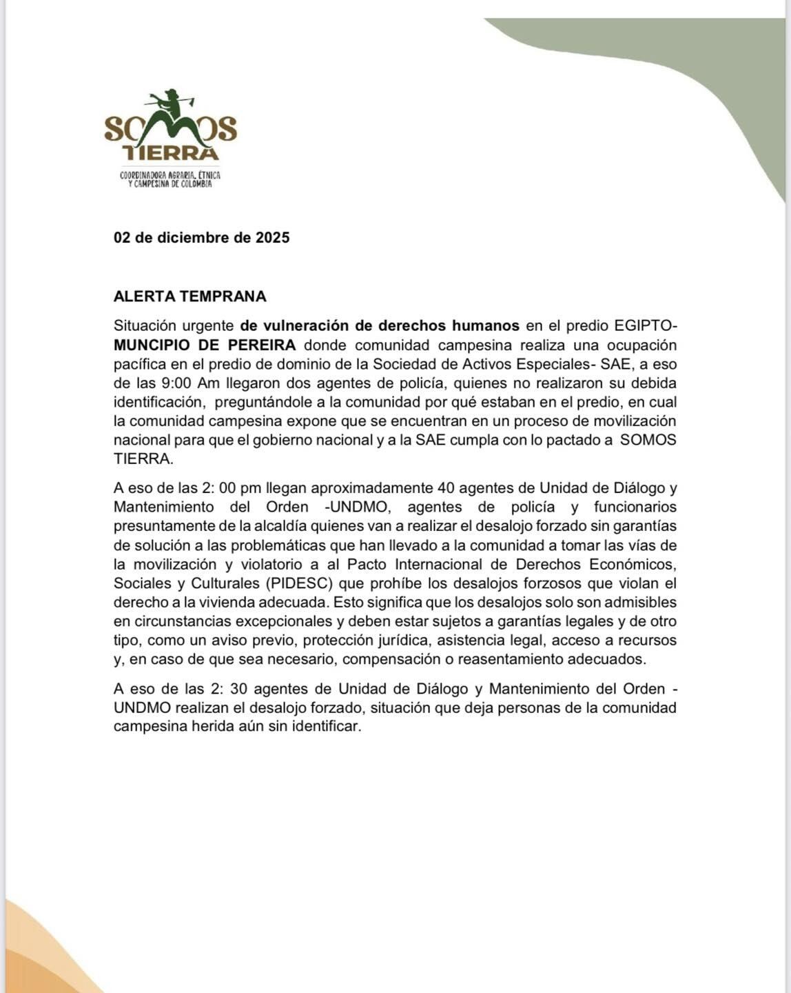 “...El desalojo forzado sin garantías de solución a las problemáticas que han llevado a la comunidad a tomar las vías de la movilización y violatorio al Pacto Internacional de Derechos Económicos, Sociales y Culturales (PIDESC) que prohíbe los desalojos forzosos que violan el derecho a la vivienda adecuada. Esto significa que los desalojos solo son admisibles en circunstancias excepcionales y deben estar sujetos a garantías legales y de otro tipo, como un aviso previo, protección jurídica, asistencia legal, acceso a recursos y, en caso de que sea necesario, compensación o reasentamiento adecuados.”