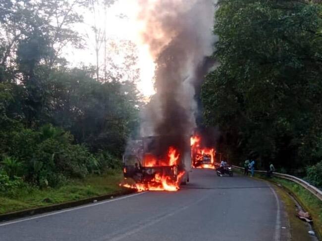 De acuerdo con información preliminar, varios hombres interceptaron los automotores, los marcaron con siglas del ELN y luego les prendieron fuego en la parte delantera. Los conductores lograron abandonar los vehículos antes de que las llamas se extendieran, por lo que no se reportan personas heridas.