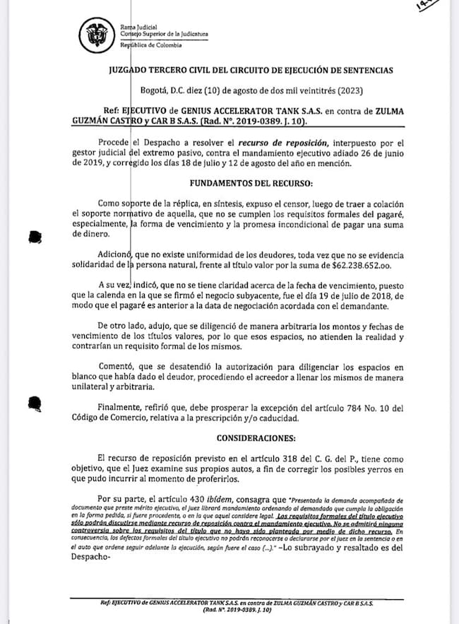 Sin embargo, La W conoció que esta misma mujer ya estaba demandada desde 2023. La demanda la hizo Genius Accelerator Tank S.A.S en contra de la mencionada y CAR B S.A.S.