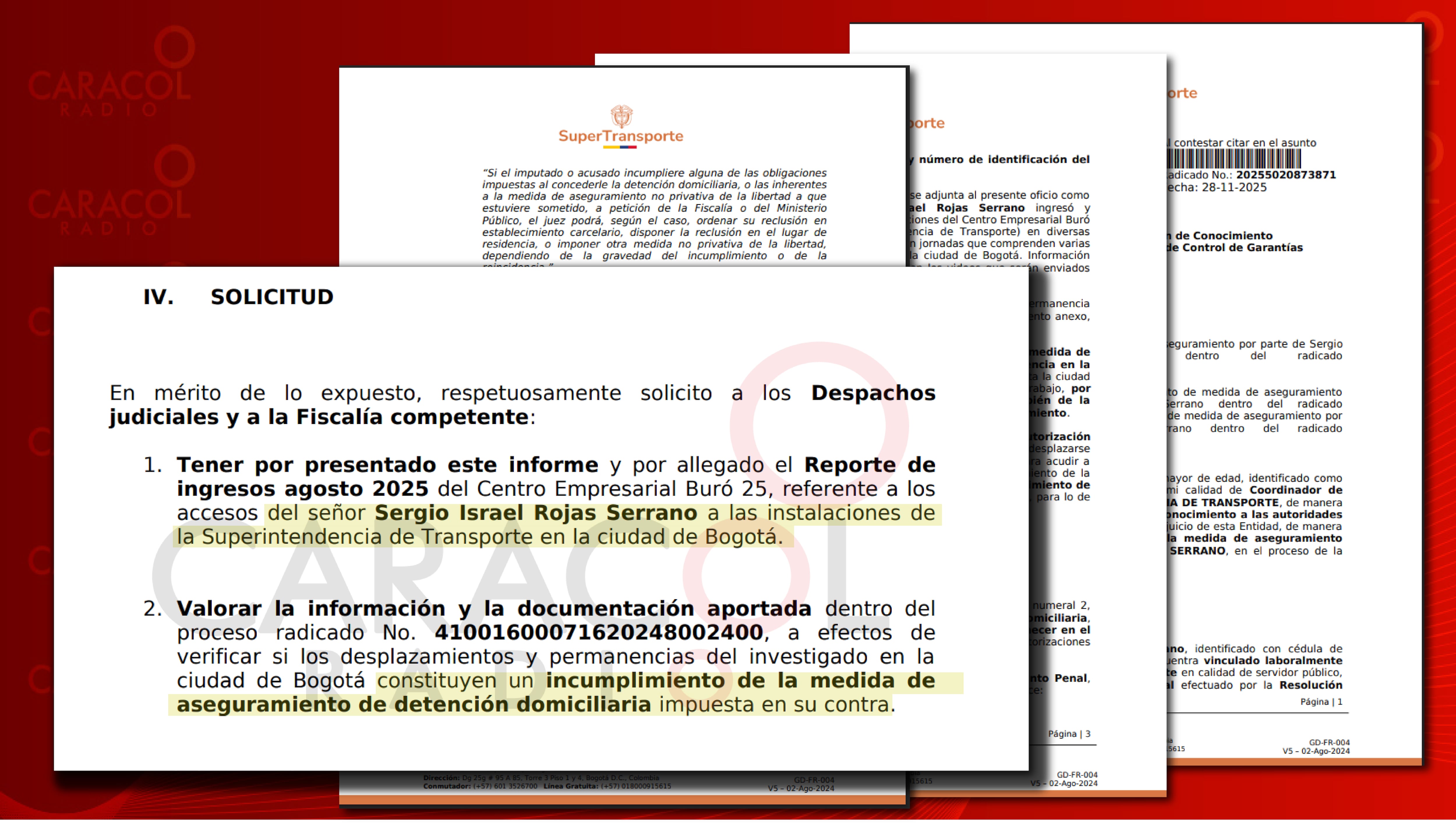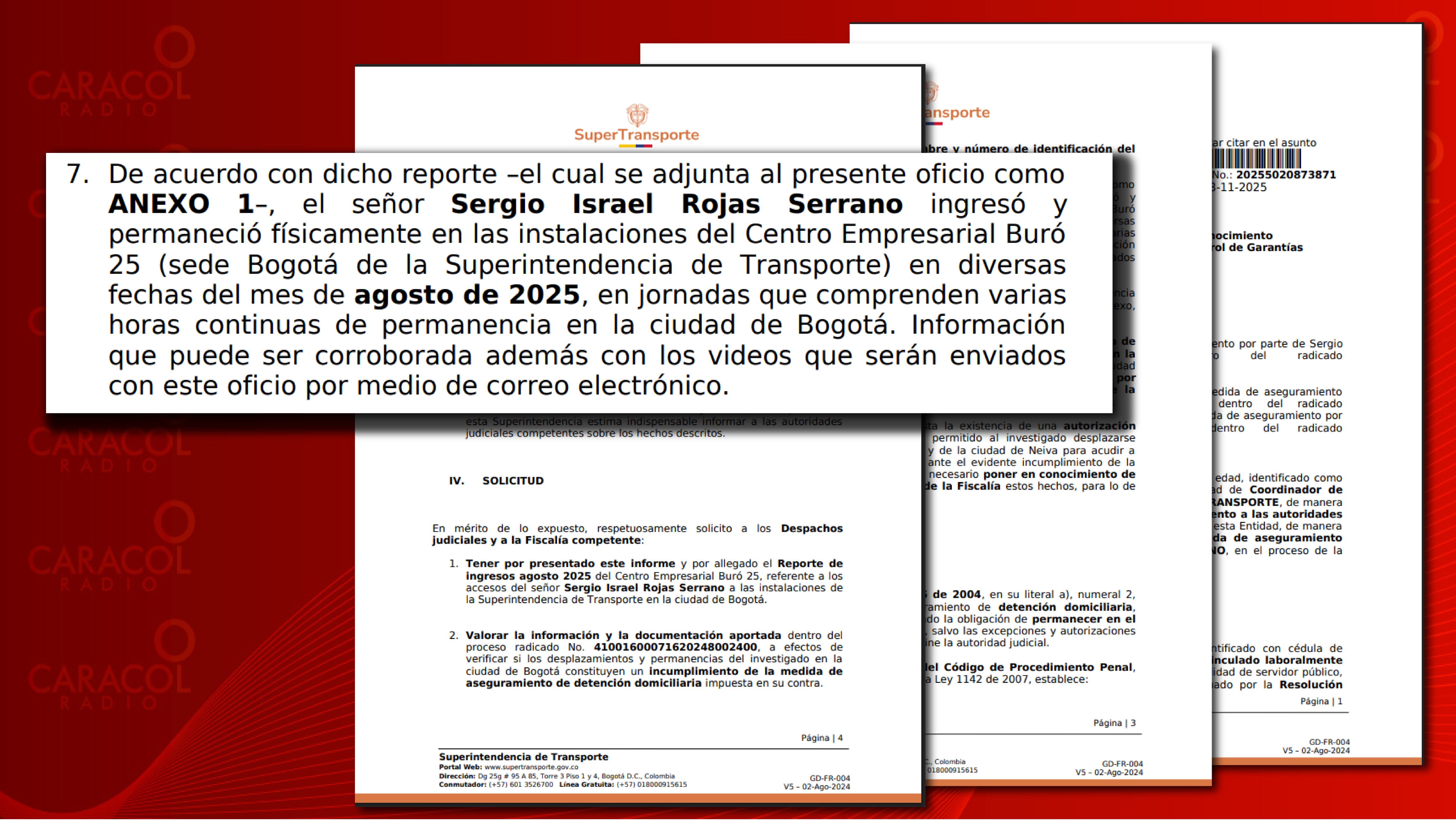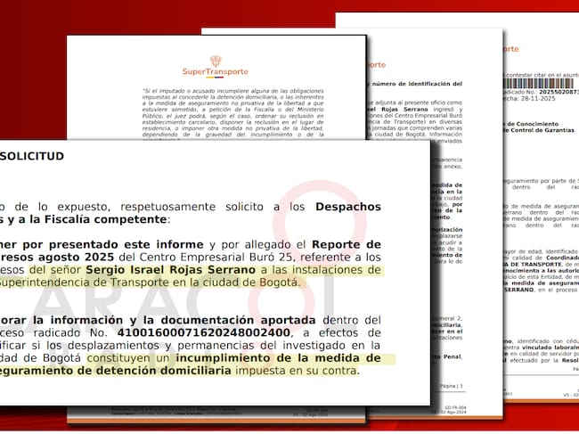 El documento que revela hoy en Caracol Radio está firmado por el coordinador de Talento Humano de la Superintendencia de Transportes quien advierte que (Sergio Israel Rojas Serrano) a pesar de tener detención domiciliaria en Neiva, se desplazó hasta Bogotá.