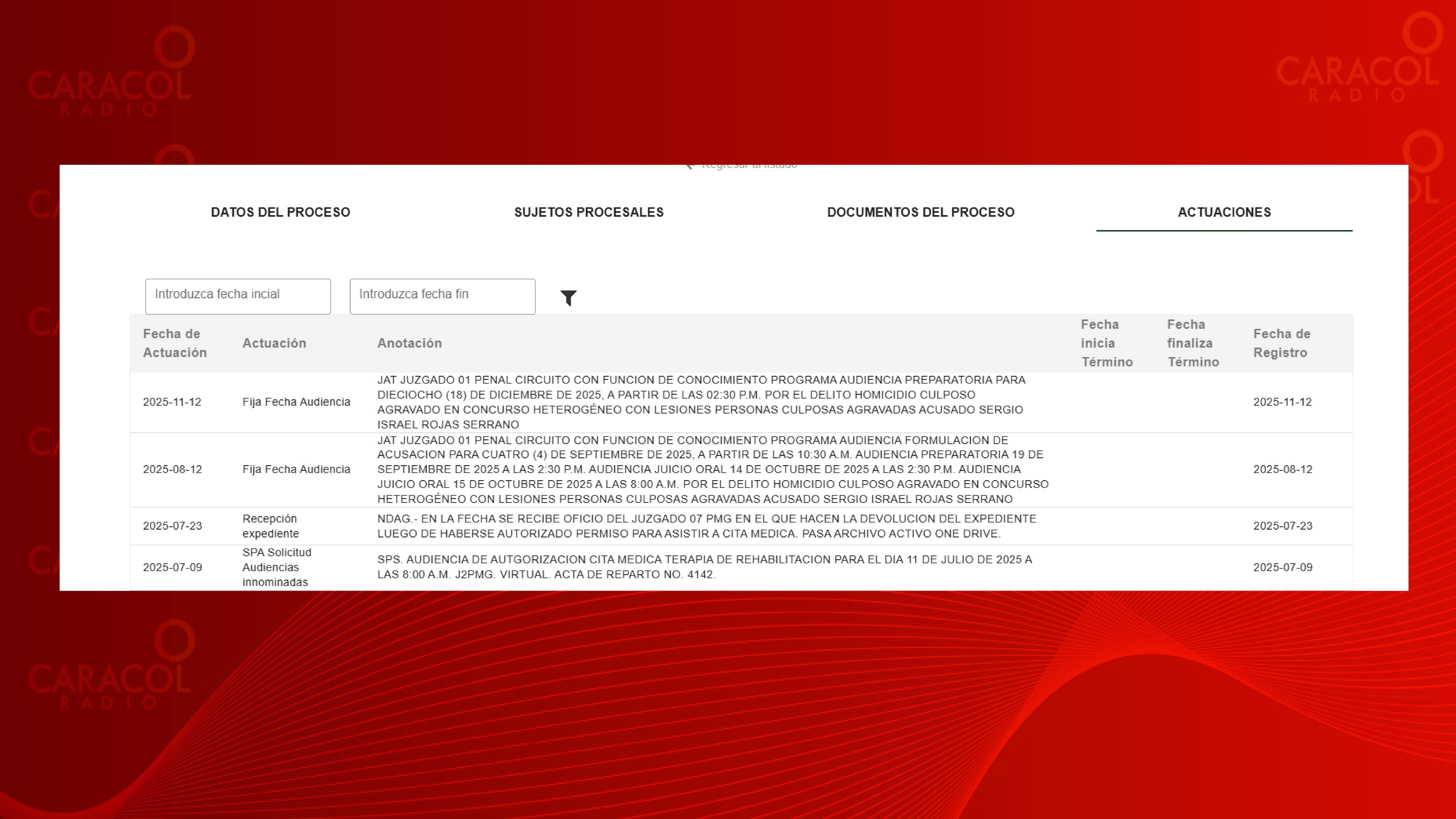 Según los registros del proceso penal, para el 18 de diciembre a las 2:30 de la tarde quedó programada la audiencia de preparatoria de juicio en su contra.