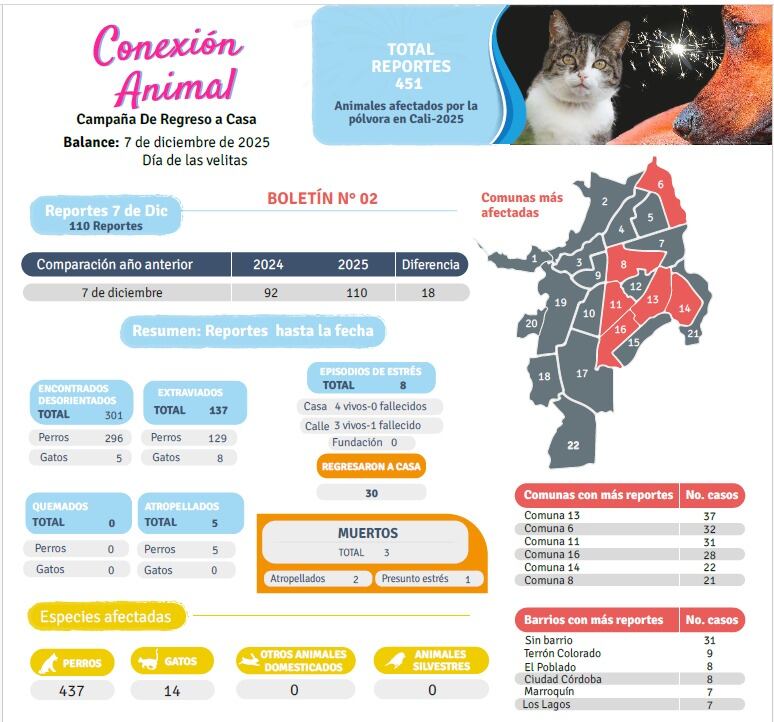 En Cali se reporta que el Día de las Velitas dejó 110 animales afectados por la pólvora sonora, 18 casos más que el año 2024.