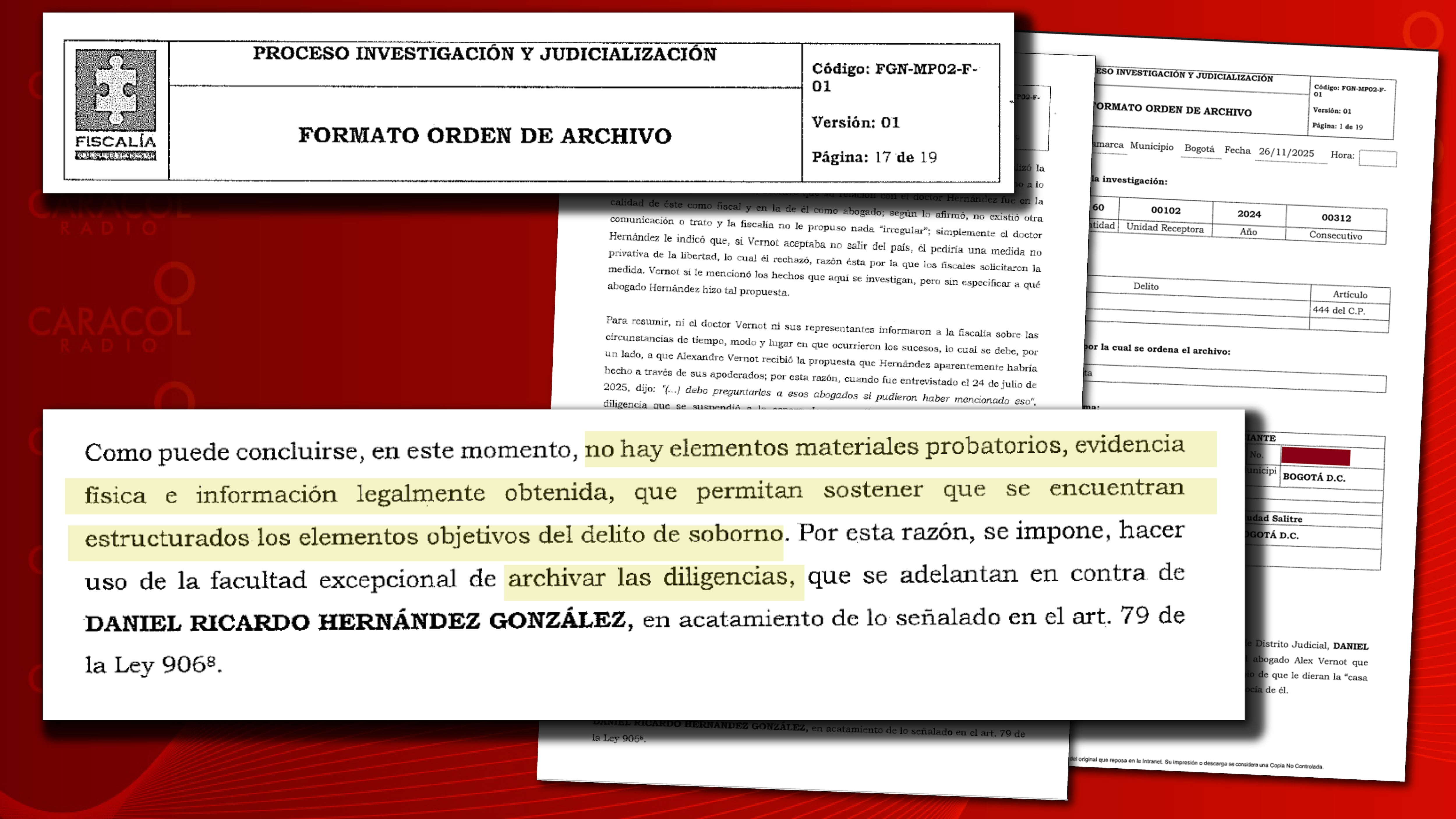 “No hay elementos materiales probatorios, evidencia física e información legalmente obtenida, que permitan sostener que se encuentran estructurados los elementos objetivos del delito de soborno. Por esta razón, se impone, hacer uso de la facultad excepcional de archivar las diligencias, que se adelantan en contra de DANIEL RICARDO HERNÁNDEZ GONZÁLEZ, en acatamiento de lo señalado en el art. 79 de la Ley 9068”.