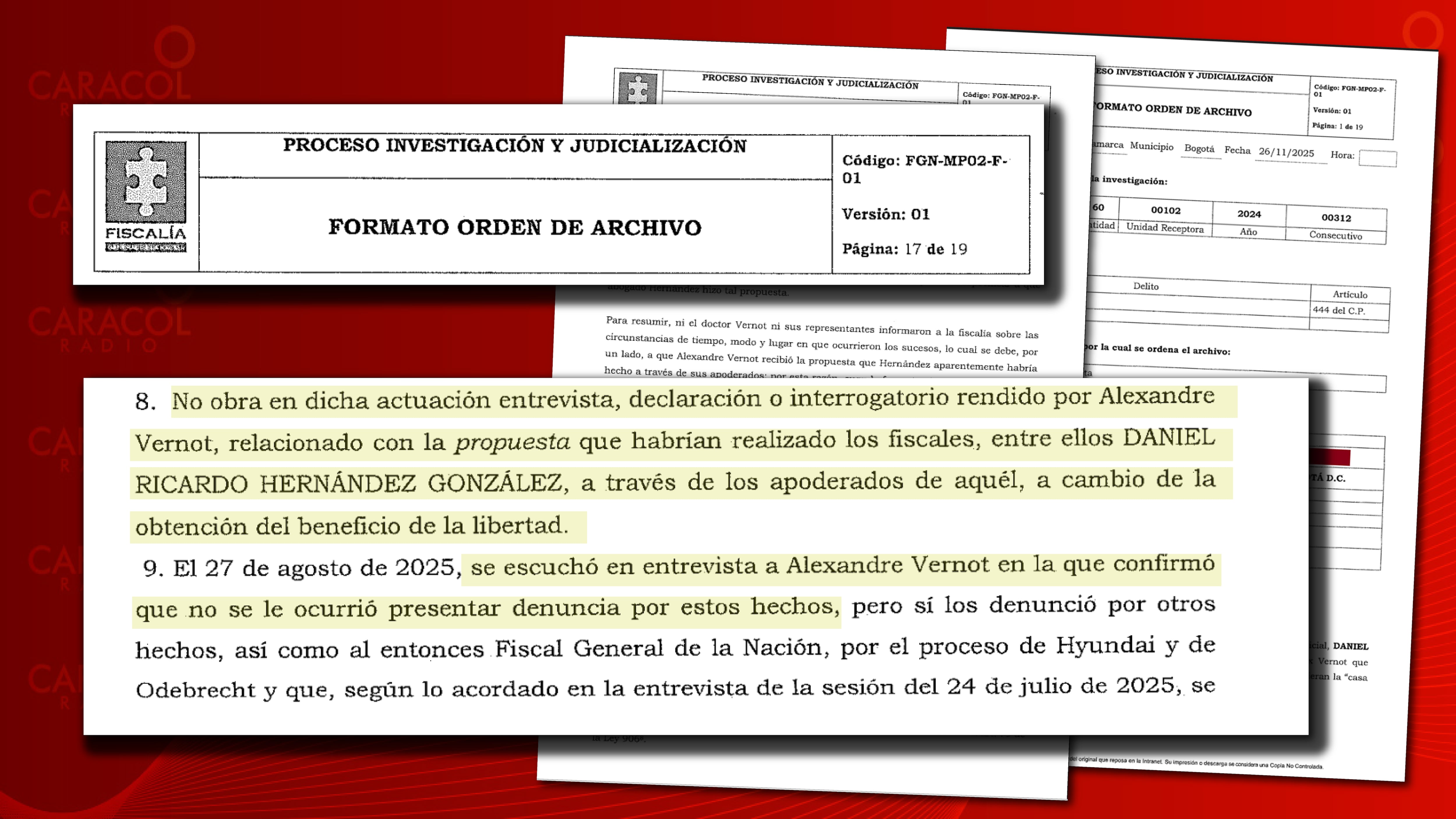 Caracol Radio conoció que la Fiscalía ordenó archivar la investigación en favor del fiscal Daniel Hernández, al concluir que no existe prueba de que el funcionario judicial haya intentado sobornar al abogado Alex Vernot en el año 2019, para incriminar al hoy presidente de la República Gustavo Petro.