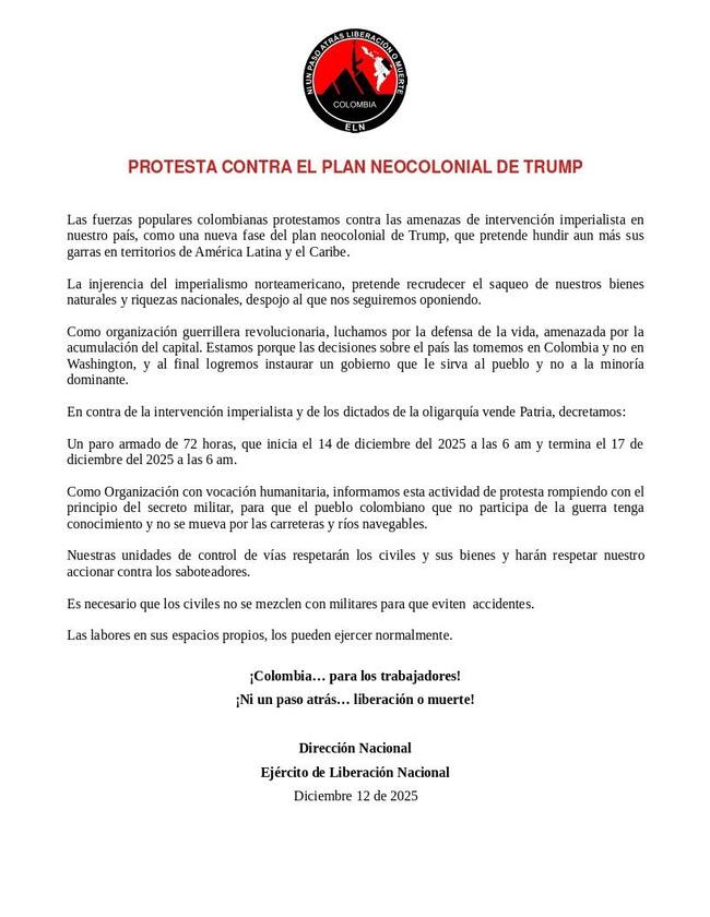 A través de un comunicado fechado este viernes 12 de diciembre, el Ejército de Liberación Nacional (ELN) anunció la realización de un paro armado de 72 horas que iniciará el 14 de diciembre a las 6:00 a. m. y se extenderá hasta el 17 de diciembre a las 6:00 a. m., en lo que la guerrilla denomina una “protesta contra el plan neocolonial de Trump”.
