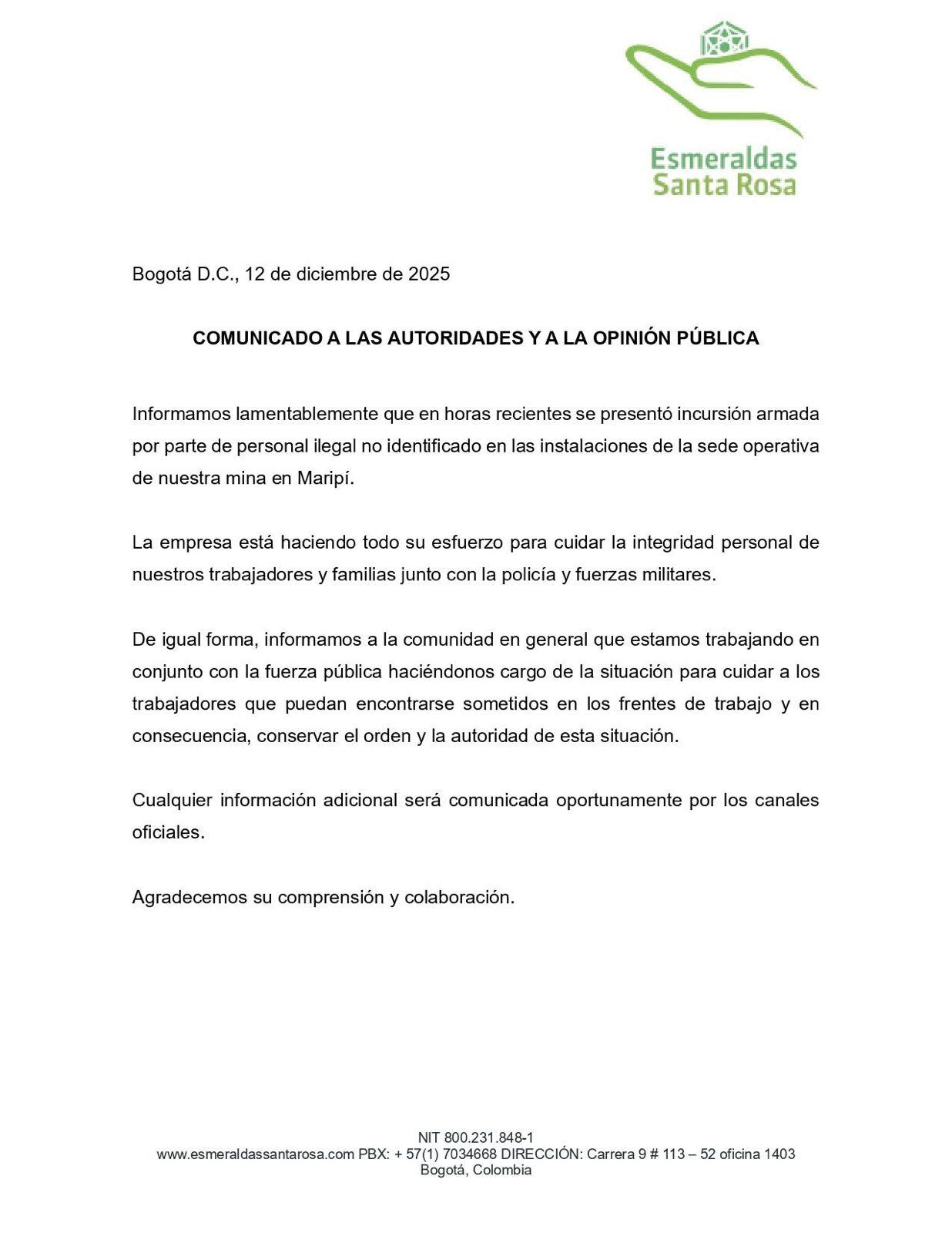 Comunicado de la empresa Esmeraldas Santa Rosa