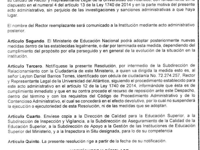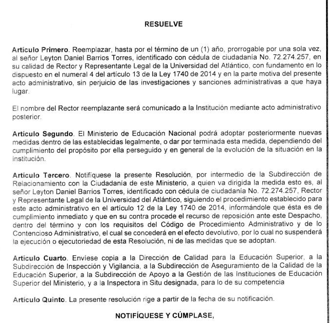 El Ministerio de Educación expidió una resolución en la cual ordena el reemplazo de Leyton Barrios de la rectoría de la Universidad del Atlántico por un término de un año, prorrogable por una sola oportunidad.