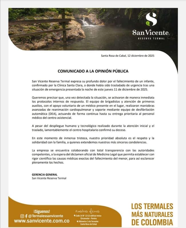 “Muy lamentable lo ocurrido con la familia de este niño. Entendemos que el hecho se presentó en un sitio de recreación del municipio de Santa Rosa de Cabal; al parecer se trataba de una familia proveniente de Santander y, aparentemente por un descuido humano, un niño de cuatro años falleció. Esta es una recomendación clara para todas las familias: cuando estemos con menores de edad, especialmente niños menores de cinco años, debemos ser sumamente cuidadosos, ya que en cualquier momento, y sobre todo en espejos de agua, un niño puede sufrir un accidente. Lamentamos profundamente lo sucedido y esperamos que avancen las investigaciones de la Fiscalía para determinar cuál fue la causa de esta situación”.