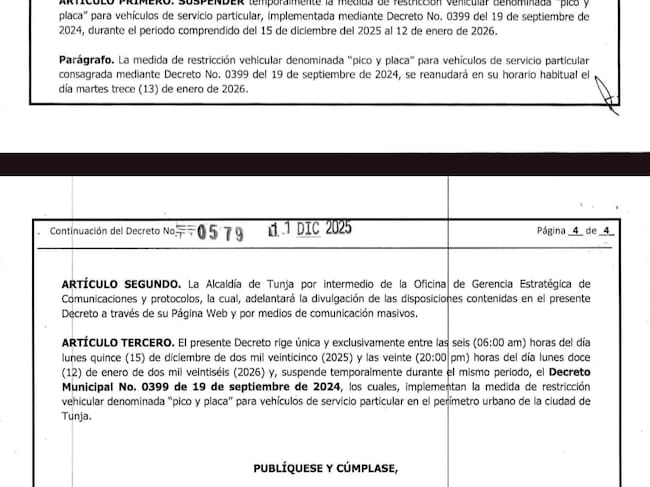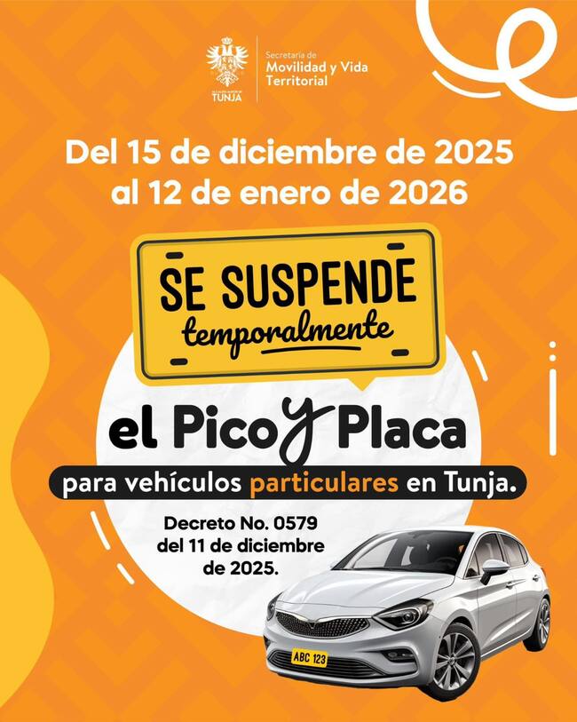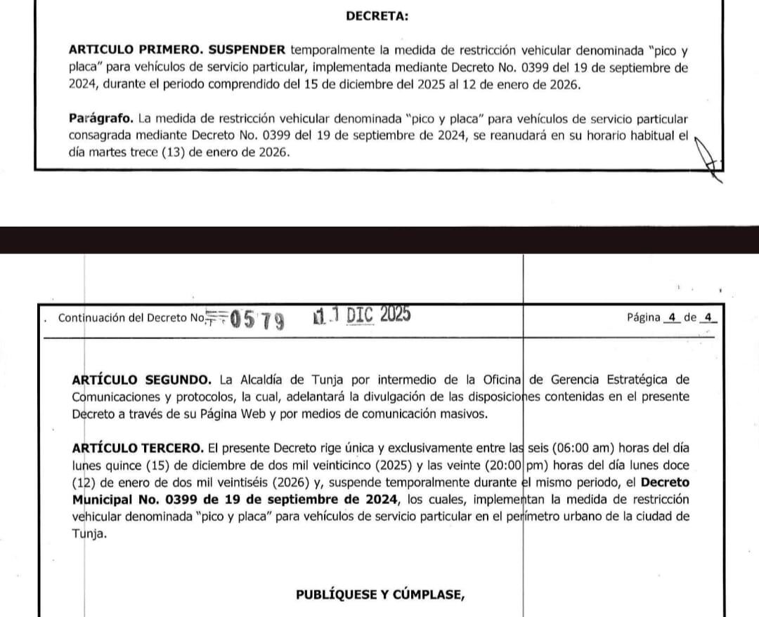 “El presente Decreto rige única y exclusivamente entre las seis (06:00 am) horas del día lunes quince (15) de diciembre de dos mil veinticinco (2025) y las veinte (20:00 pm) horas del día lunes doce (12) de enero de dos mil veintiséis (2026), y suspende temporalmente durante el mismo periodo, el Decreto Municipal No. 0399 de 19 de septiembre de 2024, los cuales, implementan la medida de restricción vehicular denominada “pico y placa” para vehículos de servicio particular en el perímetro urbano de la ciudad de Tunja”, señala el documento.