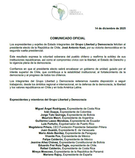 A través de una carta publicada por el grupo Libertad y Democracia, firmada por Duque, el expresidente chileno Eduardo Frei, el argentino Mauricio Macri, el mexicano Vicente Fox, el español Mariano Rajoy, entre otros, celebraron el “triunfo democrático” de Kast en el país austral.