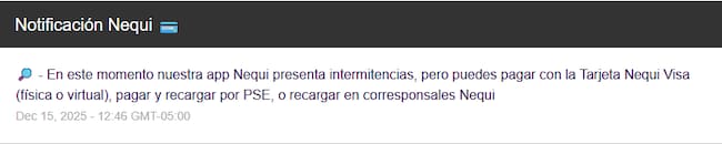 Mensaje de Nequi ante caída del 15 de diciembre de 2025. Captura de pantalla.