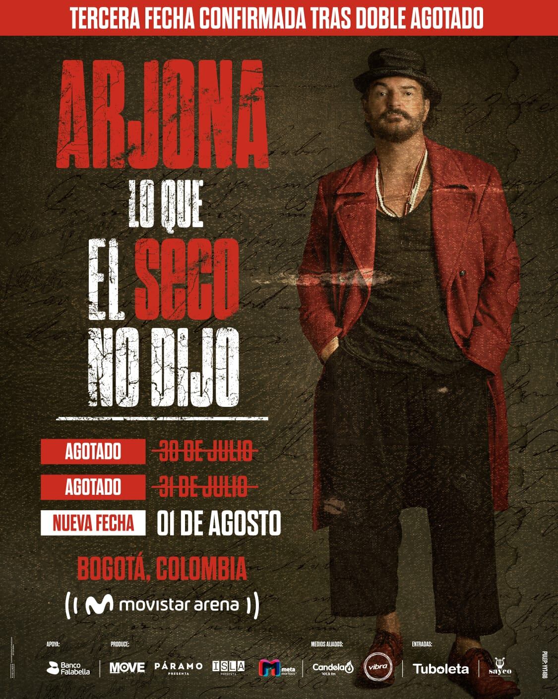 Porque dos noches no fueron suficientes, Ricardo Arjona confirma una tercera presentación en el Movistar Arena de Bogotá el próximo 1° de agosto de 2026. El cantautor guatemalteco, ícono de la música latinoamericana, regresa con su gira que ha agotado entradas en múltiples ciudades, consolidando su vigencia y conexión con el público colombiano.