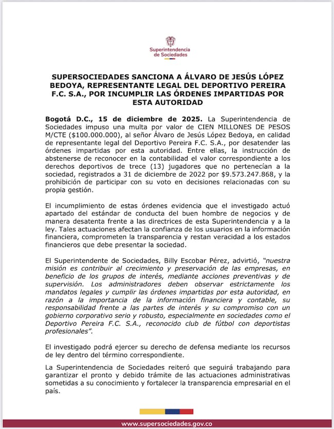 “La Superintendencia de Sociedades impuso una multa por valor de CIEN MILLONES DE PESOS M/CTE ($100.000.000), al señor Álvaro de Jesús López Bedoya, en calidad de representante legal del Deportivo Pereira F.C. S.A., por desatender las órdenes impartidas por esta autoridad. Entre ellas, la instrucción de abstenerse de reconocer en la contabilidad el valor correspondiente a los derechos deportivos de trece (13) jugadores que no pertenecían a la sociedad, registrados a 31 de diciembre de 2022 por $9.573.247.868, y la prohibición de participar con su voto en decisiones relacionadas con su propia gestión", empieza el comunicado.