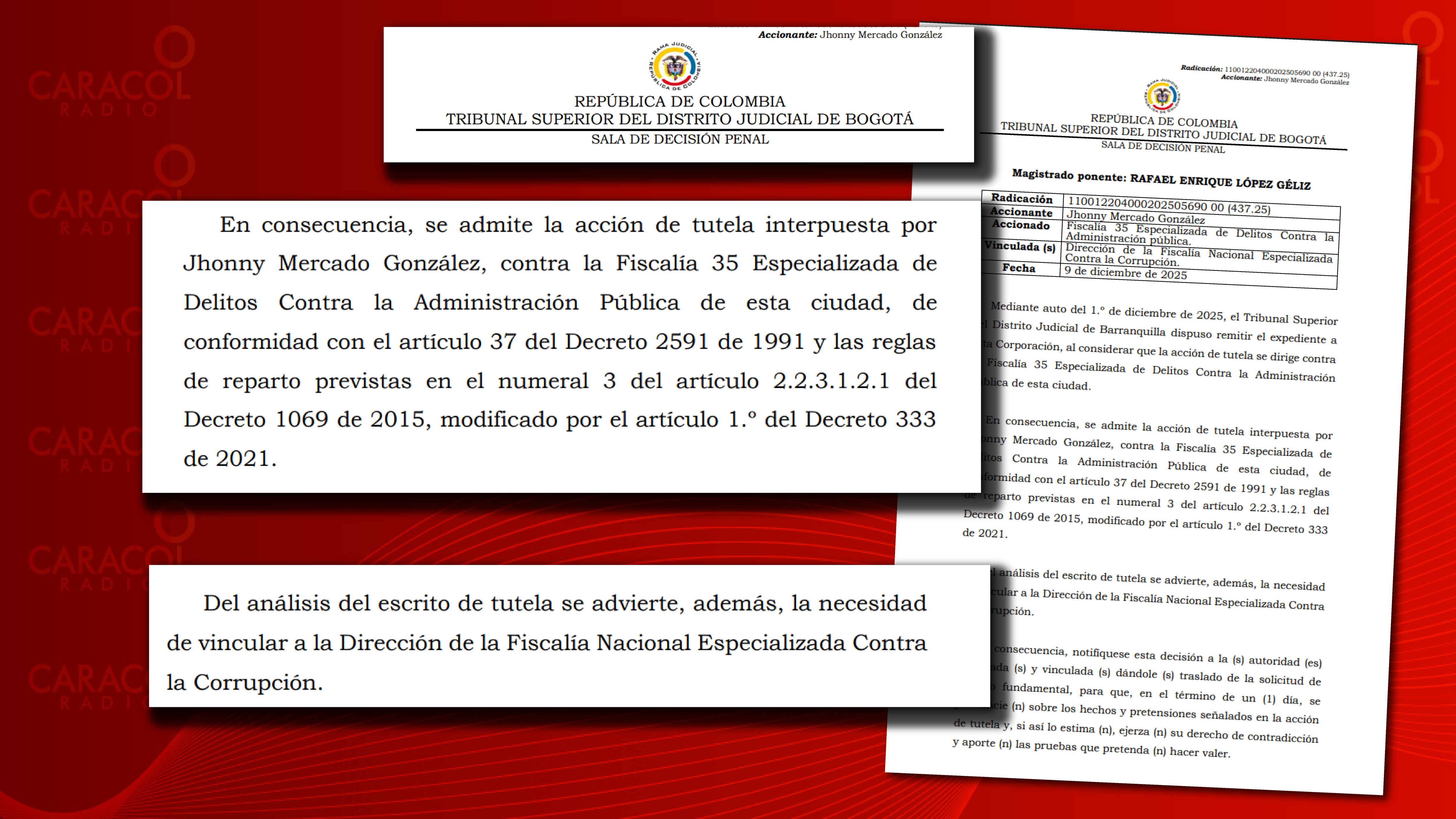 Caracol Radio conoció que el Tribunal Superior de Bogotá, admitió para su estudio la tutela que interpuso el abogado Jhonny Mercado González, en contra de la Fiscalía 35 Especializada de Delitos Contra la Administración Pública.