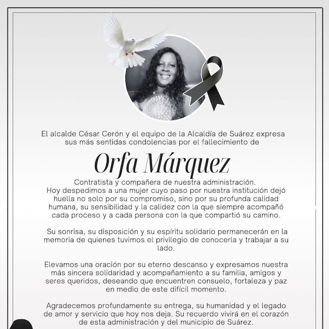 Márquez se desempeñaba como contratista de la Alcaldía de Suárez, motivo por el cual el alcalde de ese municipio, César Cerón, expresó públicamente sus condolencias a la familia de la mujer y lamentó lo ocurrido.