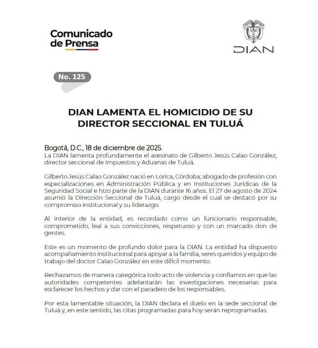 Ante el asesinato de Gilberto Calao González director seccional de la Dian en el municipio de Tuluá, centro del Valle del Cauca, ocurrido en la mañana de este jueves 18 de diciembre cuando dos hombres que se movilizaban en motocicleta llegaron a inmediaciones del barrio El Jazmín, dispararon contra el vehículo en que se movilizaba, causándole su muerte, el presidente Gustavo Petro atribuyó el ataque a una presunta infiltración de bandas criminales en las instituciones públicas.