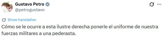 “Cómo se le ocurre a esta ilustre derecha ponerle el uniforme de nuestra fuerzas militares a una pederasta”, dijo el mandatario.