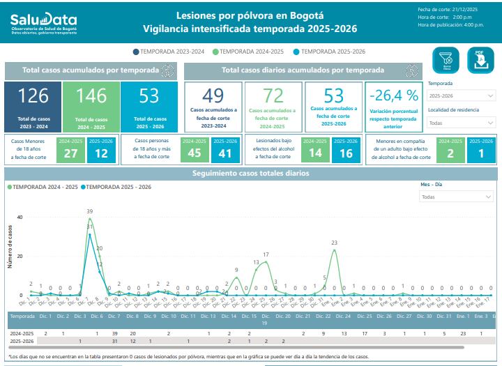 La Secretaría Distrital de Salud informó que, con corte al 20 de diciembre de 2025, en la capital del país se han registrado 53 personas afectadas por quemaduras y otras lesiones asociadas a la manipulación de artículos pirotécnicos durante la temporada decembrina.