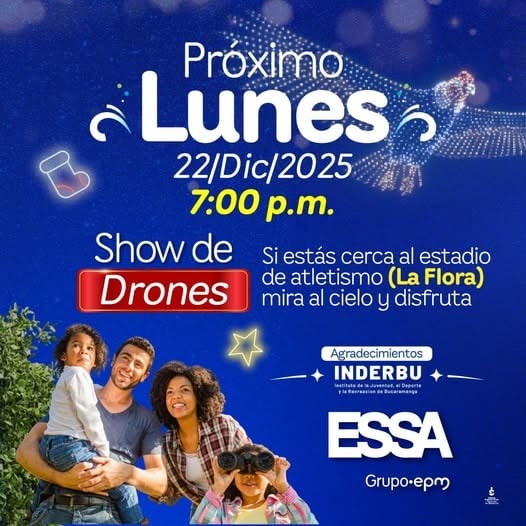 Bucaramanga vivirá una noche llena de luz de Navidad hoy lunes 22 de diciembre, cuando el cielo se convierta en el escenario principal de un show de drones de gran formato que realizará la Electrificadora de Santander - ESSA; considerado el más ambicioso que se haya realizado hasta ahora en la ciudad.