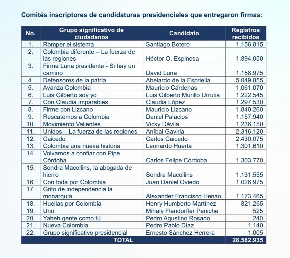 Este proceso es clave porque define quiénes podrán inscribirse oficialmente como candidatos presidenciales. La Registraduría debe certificar si cada aspirante cumple o no con el número mínimo de firmas válidas exigidas por la ley (+635.000).